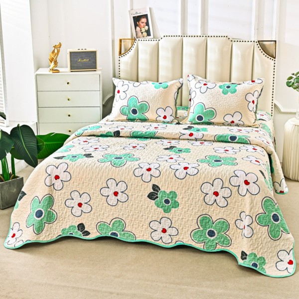 Cuvertură Matlasată din Bumbac Satinat, cu Bordură în Valuri (220x230 cm) + 2 Fețe de Pernă (60x80 cm), Crem, Verde, Flori, Casa Minunata, cod produs: INS-CVS05