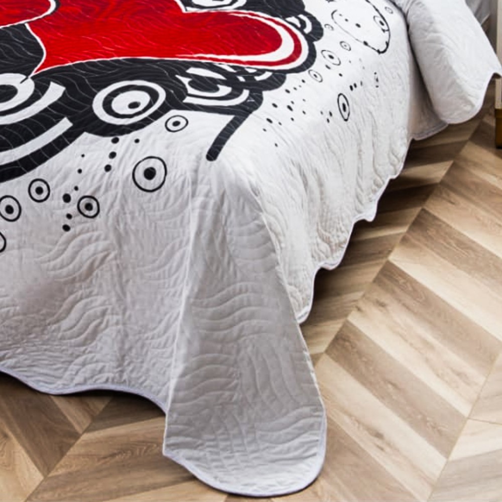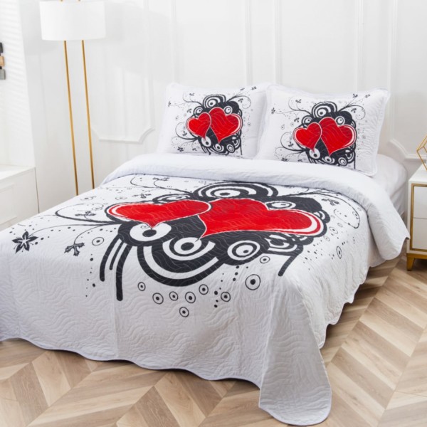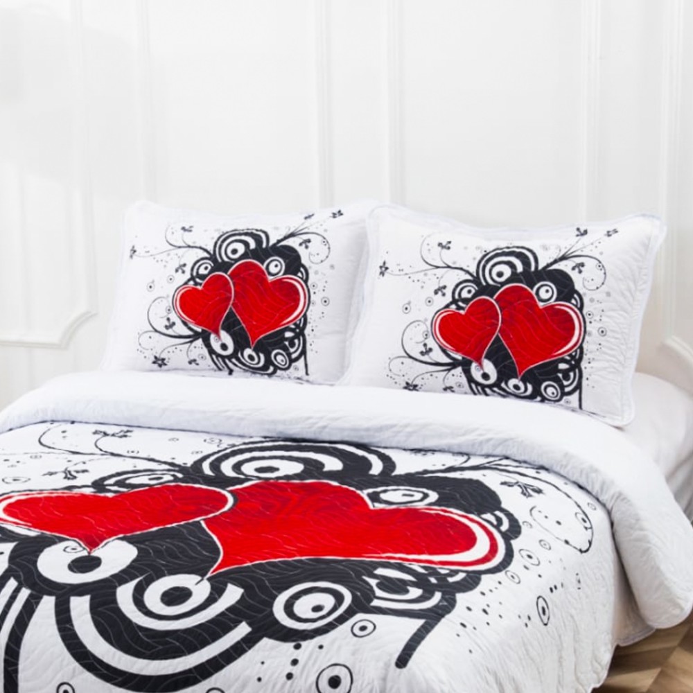 Cuvertură Matlasată, Pat Dublu, 230x250 cm, 3 Piese, Bumbac Finet Satinat, Imprimeu Digital, IDENTIC CU POZA, 2 Fețe de Pernă 60x80 cm, Alb, Negru, Roșu, Inimioare, Casa Minunata, cod produs: INS-CVD06