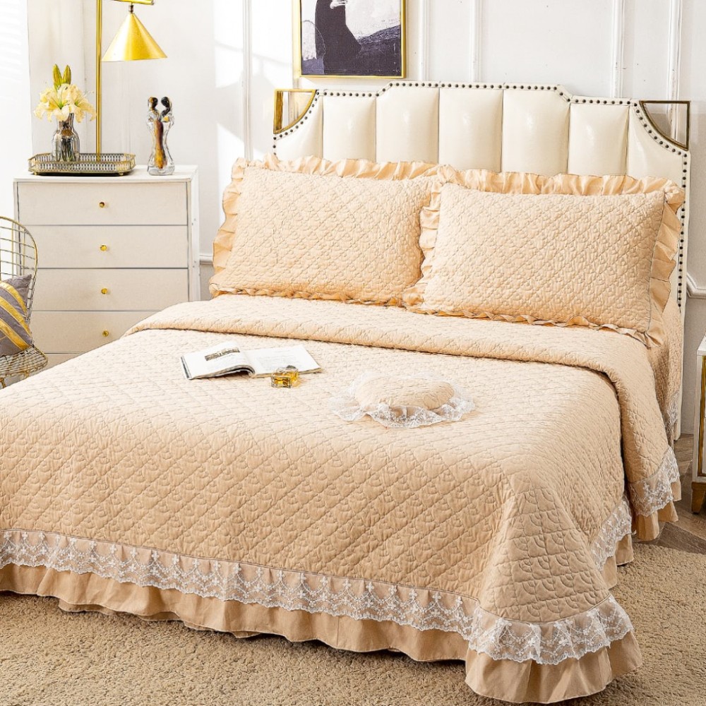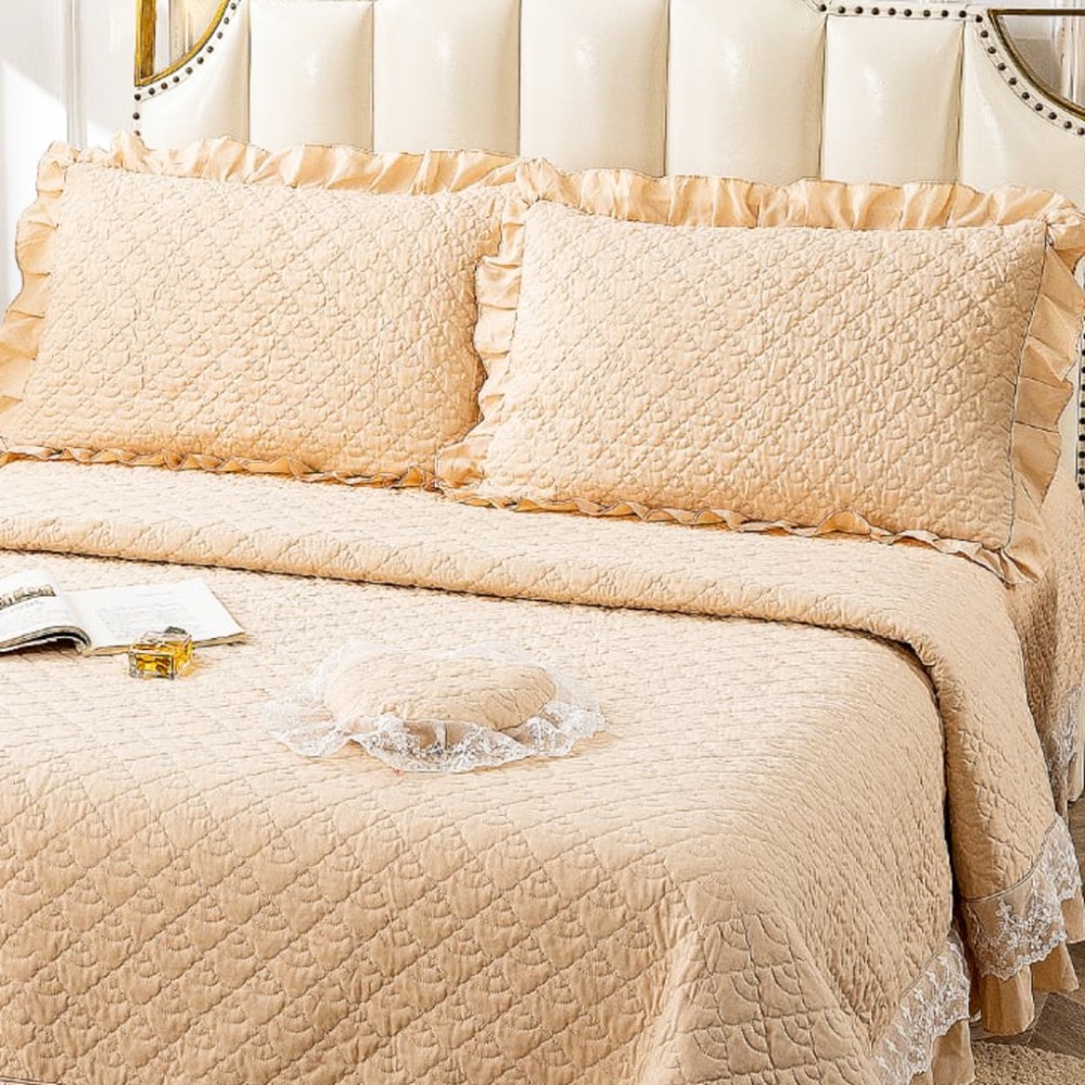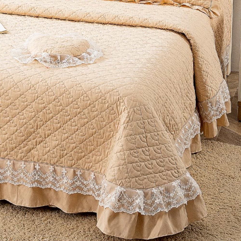 Cuvertură matlasată din bumbac finet cu volănașe și dantelă Chantilly – Eleganță și confort pentru dormitorul tău