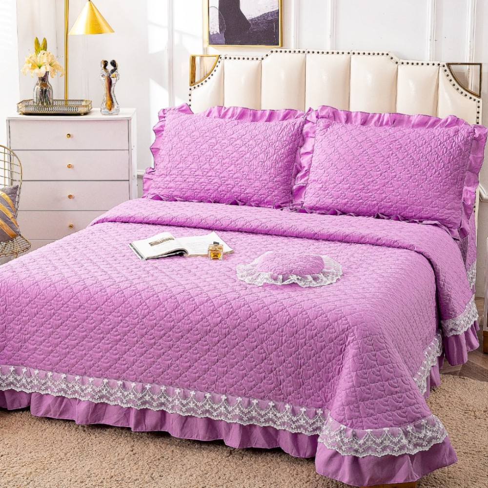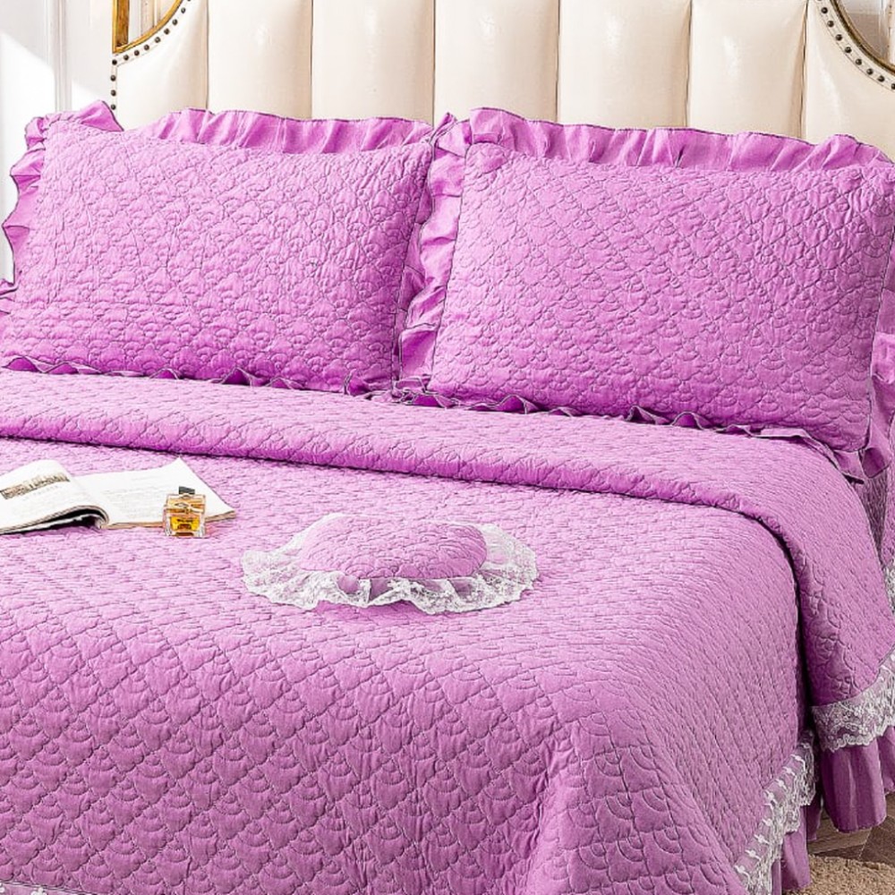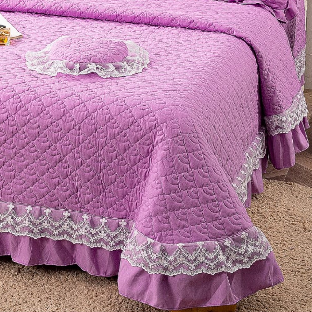 Cuvertură Matlasată, Pat Dublu, Bumbac Finet, 230x250cm, 4 piese, cu Volănașe și Dantelă Chantilly Alba, Lila, Casa Minunata, cod produs: INS-CVB04