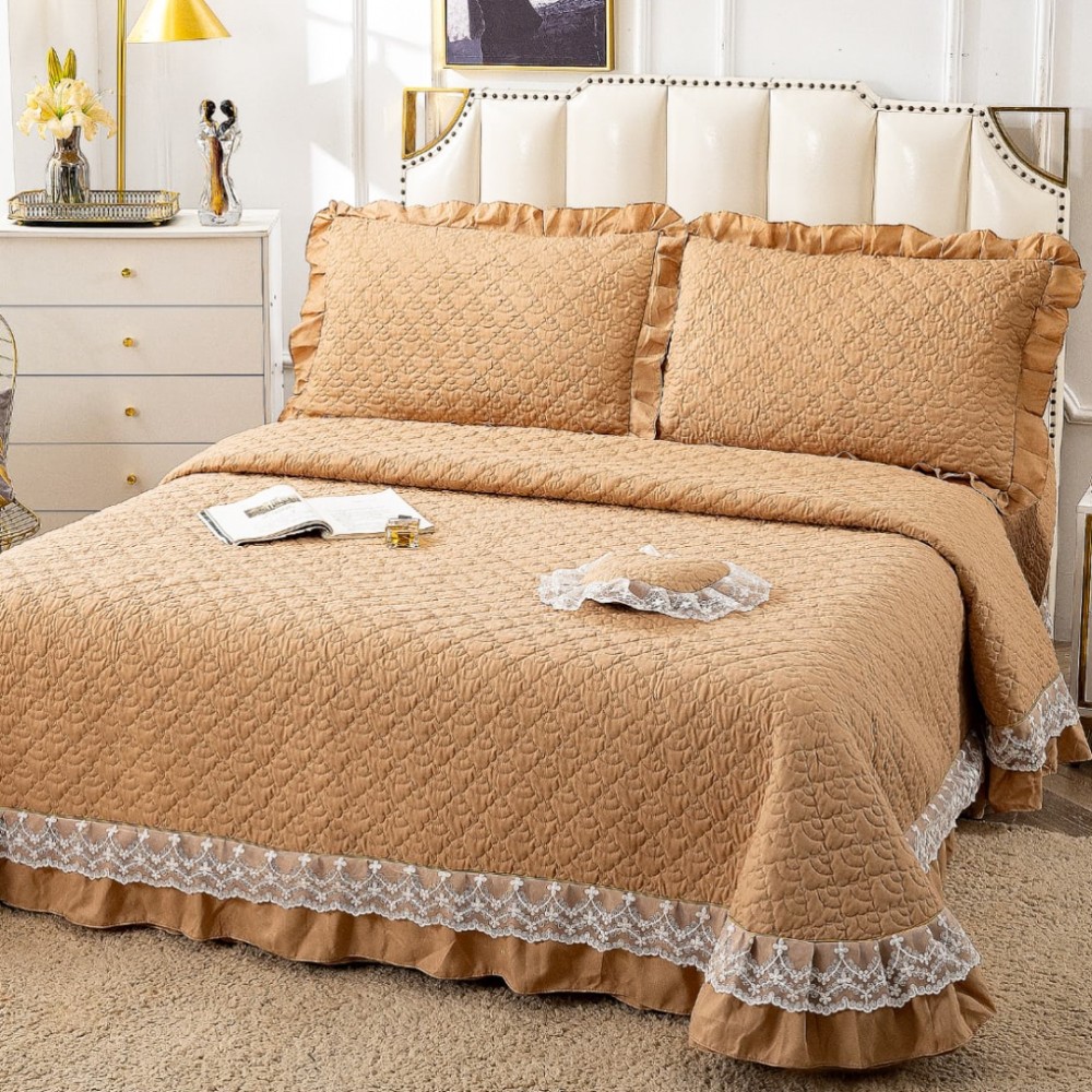 Cuvertură Matlasată, Pat Dublu, Bumbac Finet, 230x250cm, 4 piese, cu Volănașe și Dantelă Chantilly Alba, Maro, Casa Minunata, cod produs: INS-CVB05