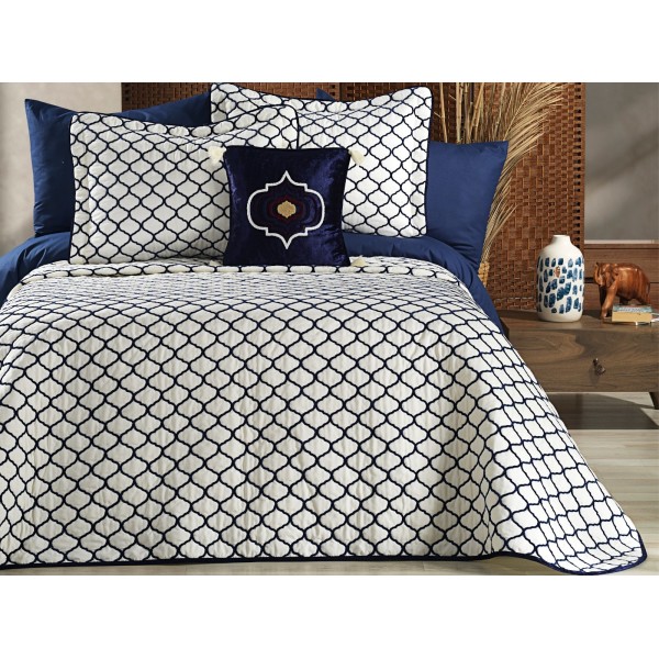 Cuvertura MELODIE pentru pat dublu cu smocuri brodate si 3 fete de perna, Alb-Albastru, Casa Sabry, cod produs: CVS41