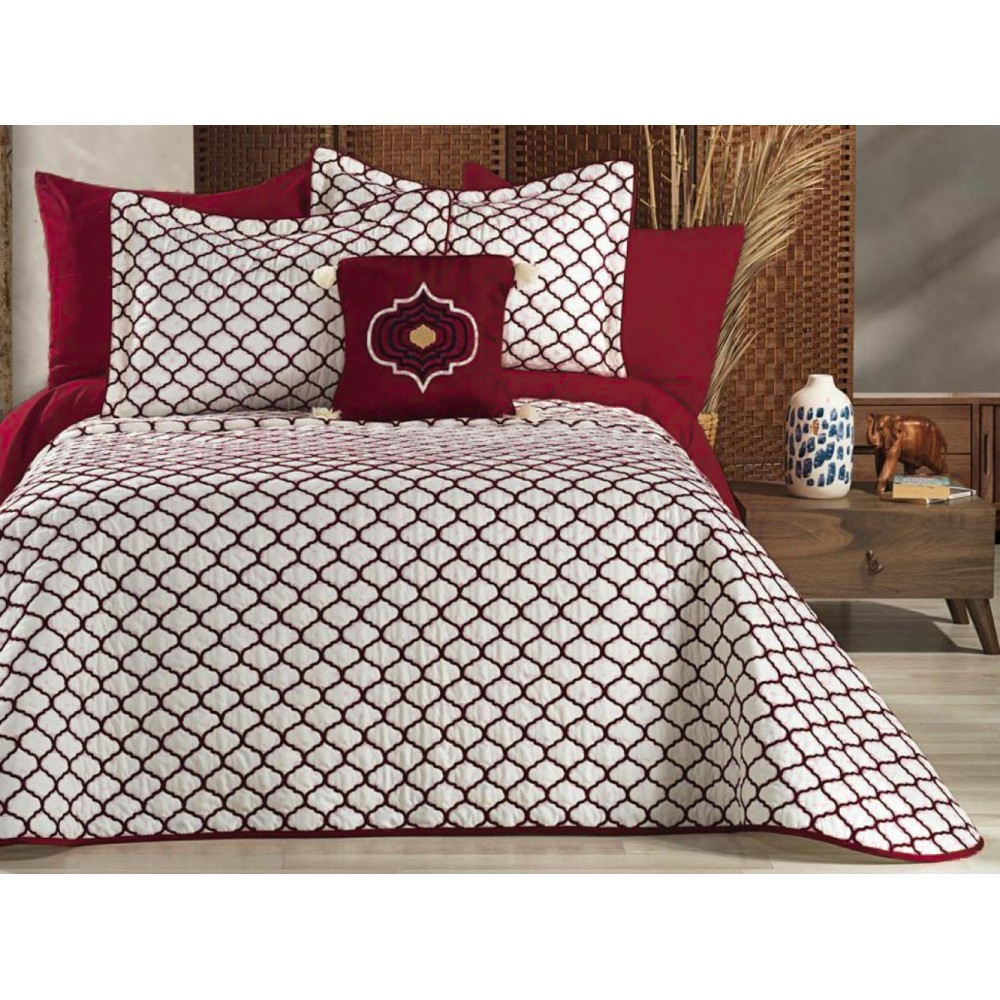 Cuvertura MELODIE pentru pat dublu cu smocuri brodate si 3 fete de perna, Alb-Visiniu, Casa Sabry, cod produs: CVS42