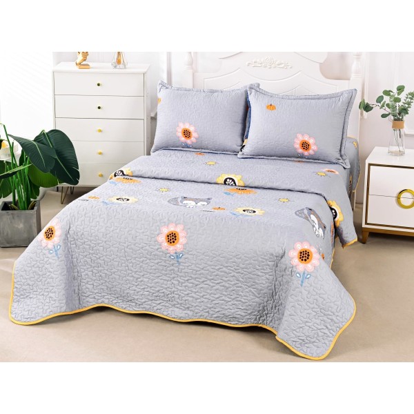 Cuvertura pat 1 PERSOANA din Bumbac Satinat Superior, 3 PIESE, Gri, flori, pisicute, Alti producatori, cod produs: CVP501