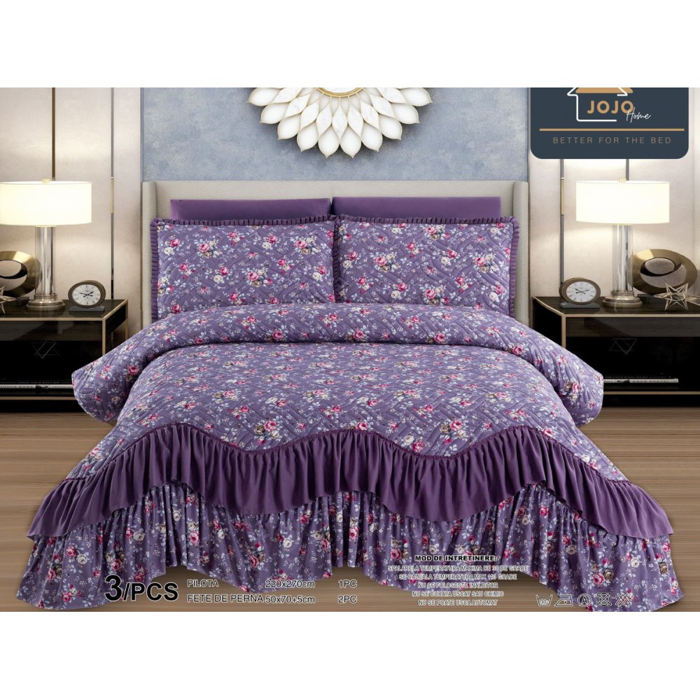 Cuvertură de lux, pentru pat 2 persoane, din bumbac tip finet, cu volanase atasate, pentru un plus de eleganta si rafinament. Cuverturile de pat sunt cele mai potrivite pentru anotimpul rece. Totodată, ele adaugă mai multă căldură dormitorului tău.