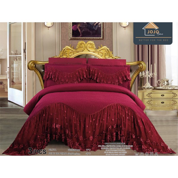 Cuvertura pat dublu, 3 piese, Bumbac Finet, 220x280cm, cu volanase si broderie, Jojo Home, Grena, cod produs: JOC5