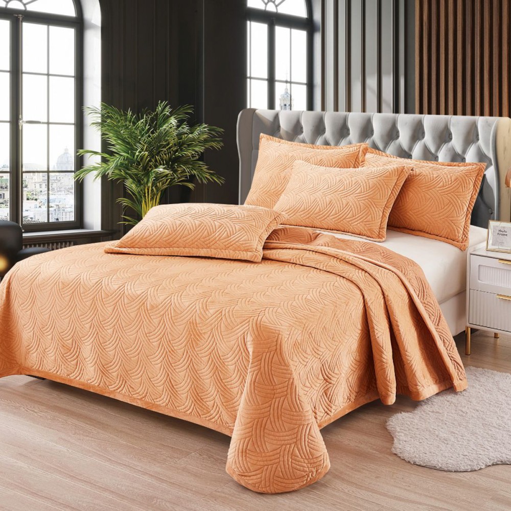 Cuvertura pat dublu, 3 piese, Catifea Matlasata 230x250cm + 2 fete de perne 50x70cm, bej deschis, CumparaMisim, cod produs: YAC107