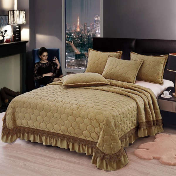 Cuvertură de lux, pentru pat 2 persoane, din catifea, matlasata, accesorizata cu volanas si broderie eleganta, de culoarea bronz.