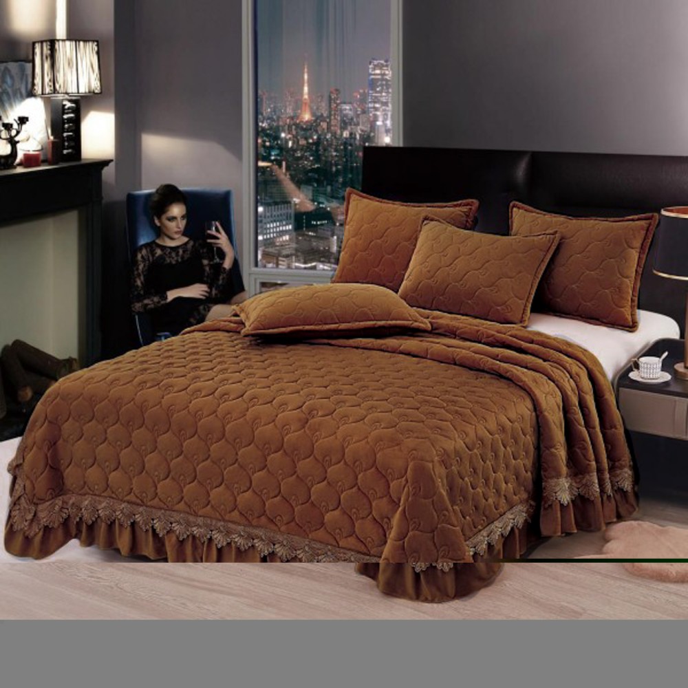 Cuvertura pat dublu, 3 piese, Catifea Matlasata cu broderie, 220x240cm + 2 fete de perne 50x70cm, maro, CumparaMisim, cod produs: YAC300
