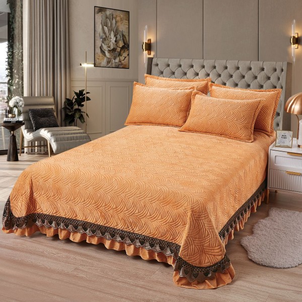 Cuvertură de lux, pentru pat 2 persoane, din catifea, matlasata, accesorizata cu volanas si broderie eleganta, de culoarea bronz.