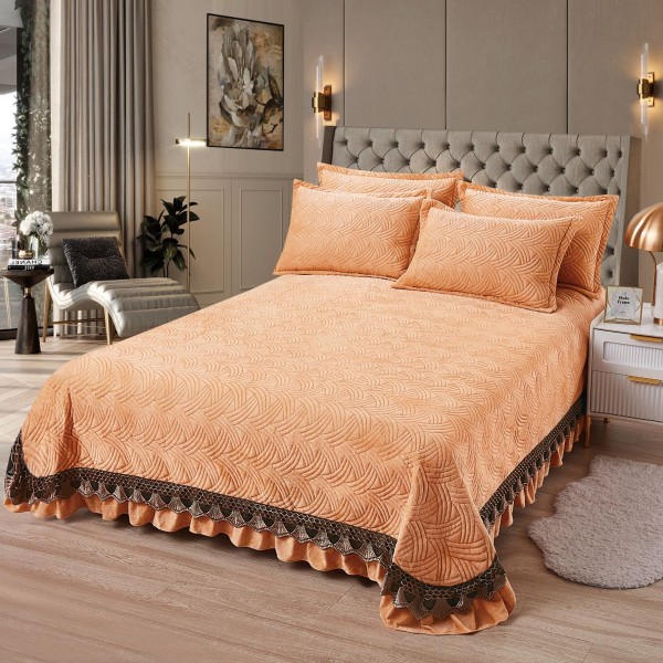 Cuvertura pat dublu, 3 piese, Catifea Matlasata cu broderie, 220x240cm + 2 fete de perne 50x70cm, piersica, CumparaMisim, cod produs: YAC203
