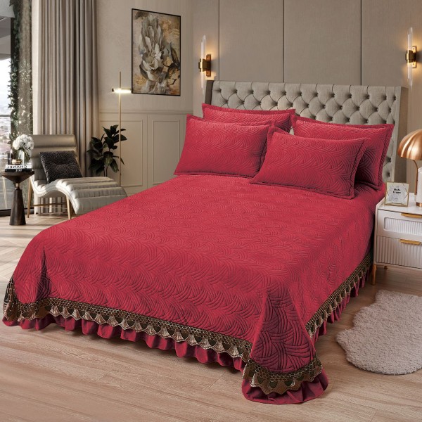 Cuvertura pat dublu, 3 piese, Catifea Matlasata cu broderie, 220x240cm + 2 fete de perne 50x70cm, rosu, CumparaMisim, cod produs: YAC205