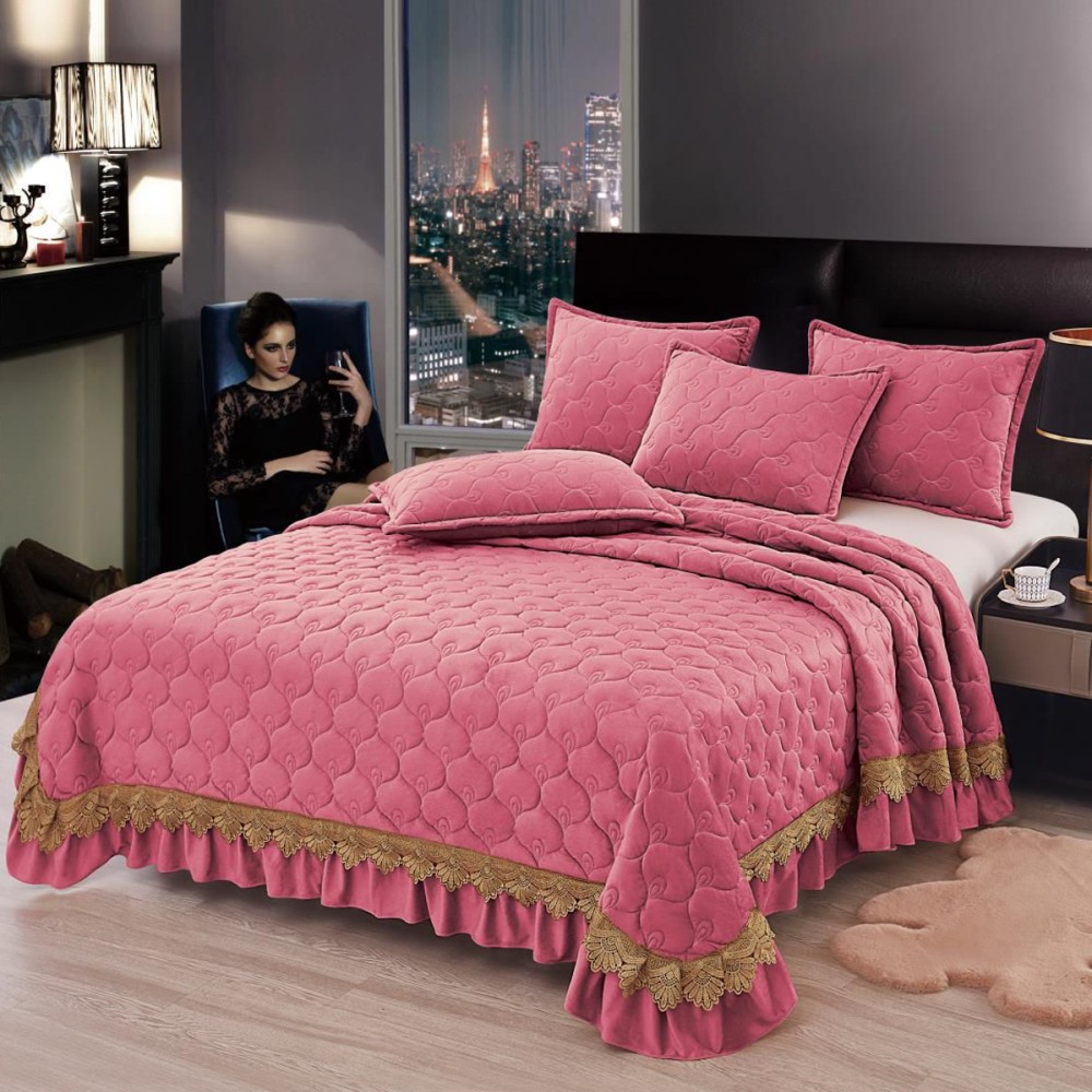 Cuvertura pat dublu, 3 piese, Catifea Matlasata cu broderie, 220x240cm + 2 fete de perne 50x70cm, roz, CumparaMisim, cod produs: YAC308