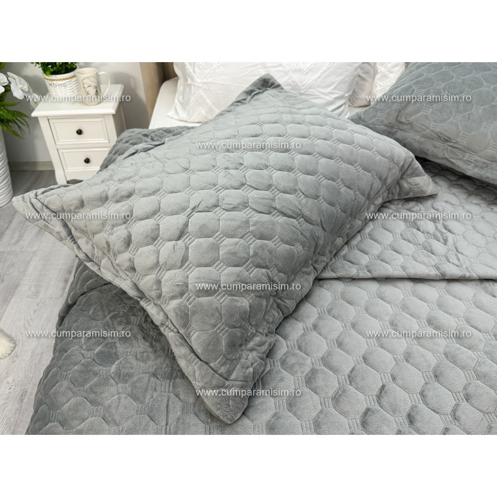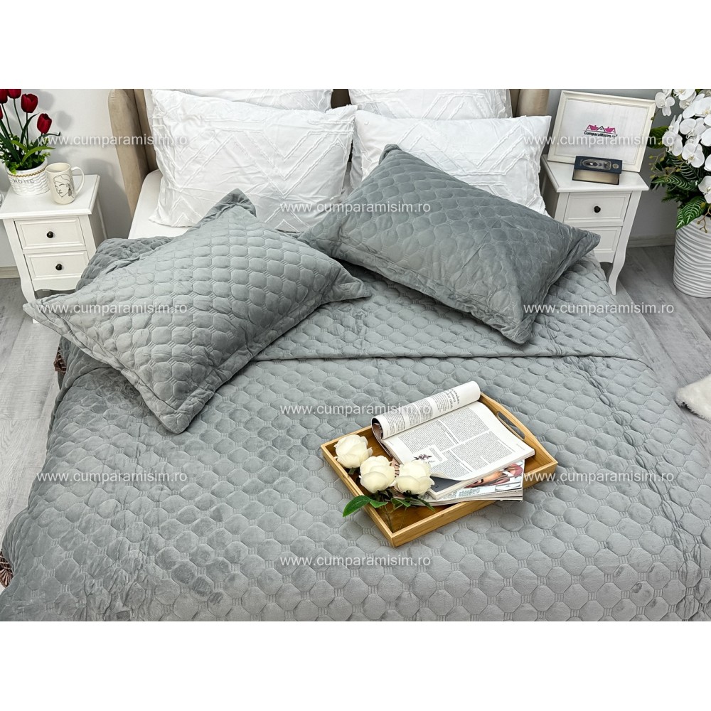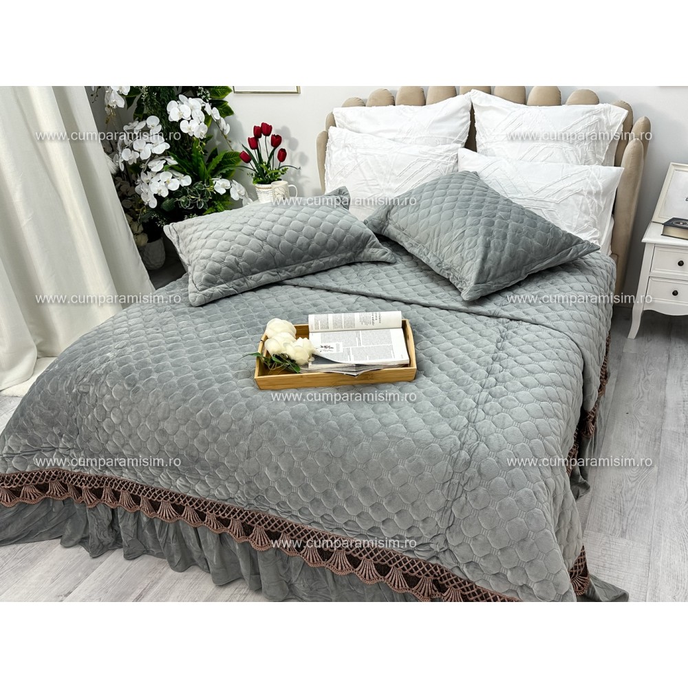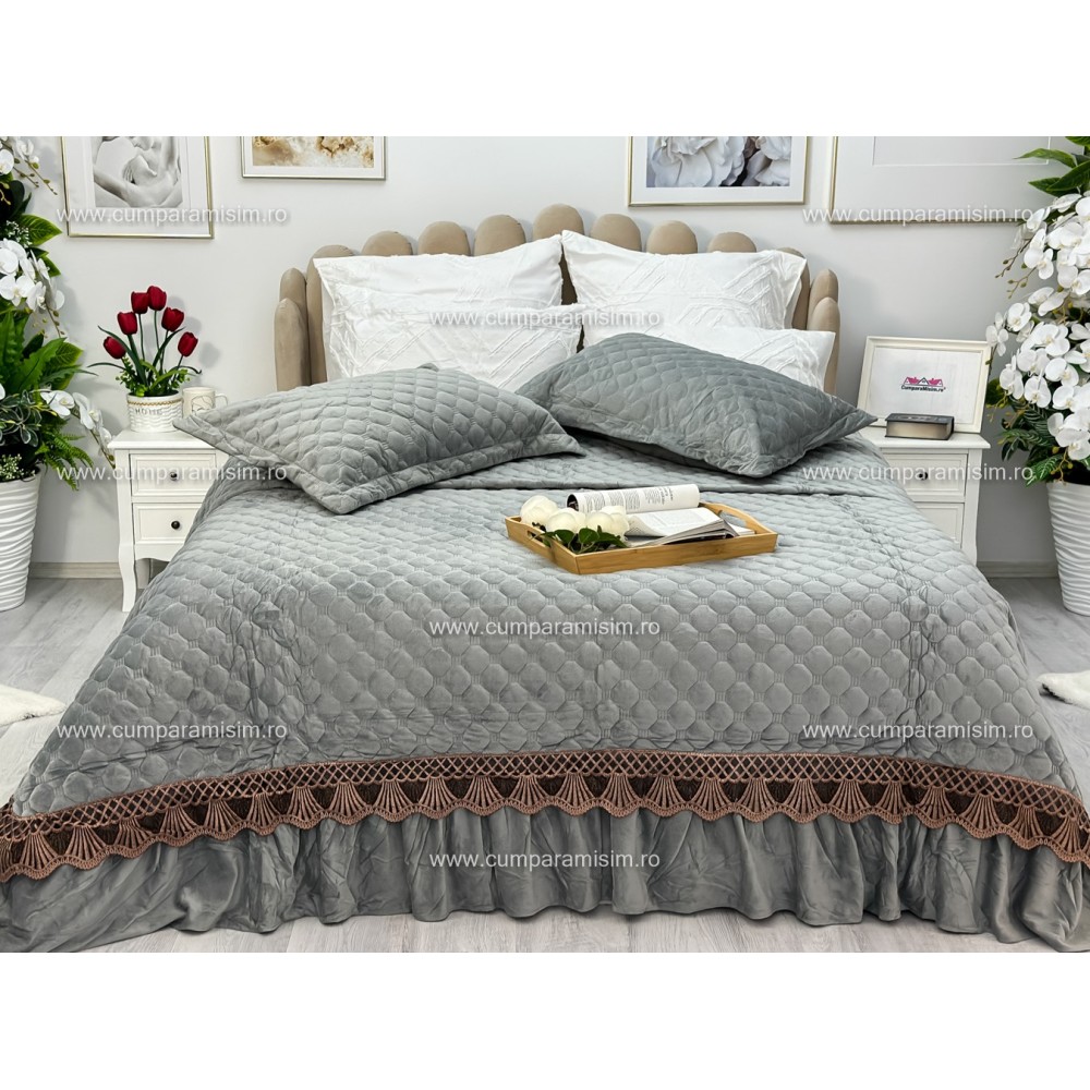 Cuvertura pat dublu, 3 piese, Catifea Matlasata cu Broderie Aurie, 250x270cm, Jojo Home, Gri deschis, cod produs: JOC208