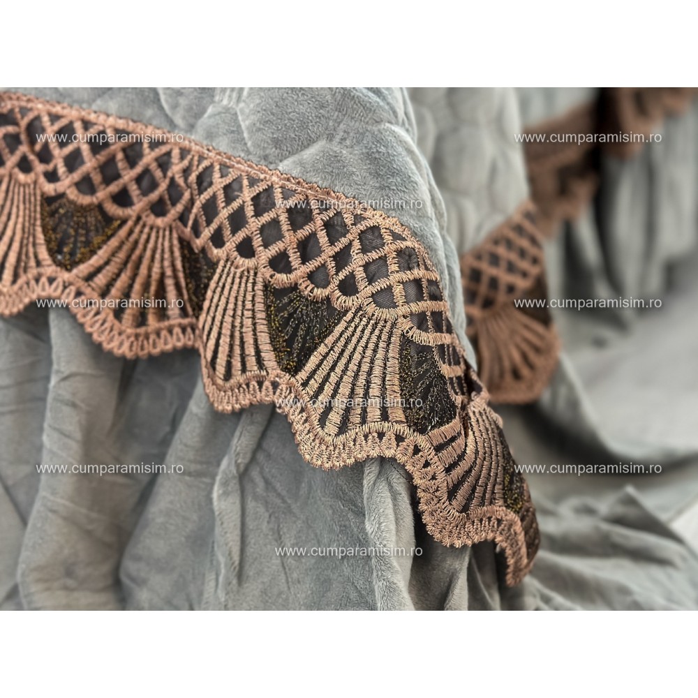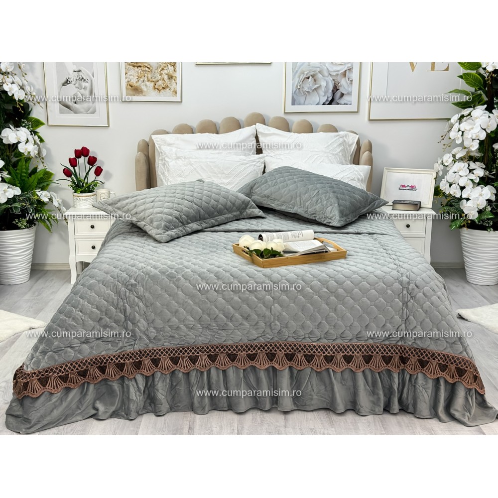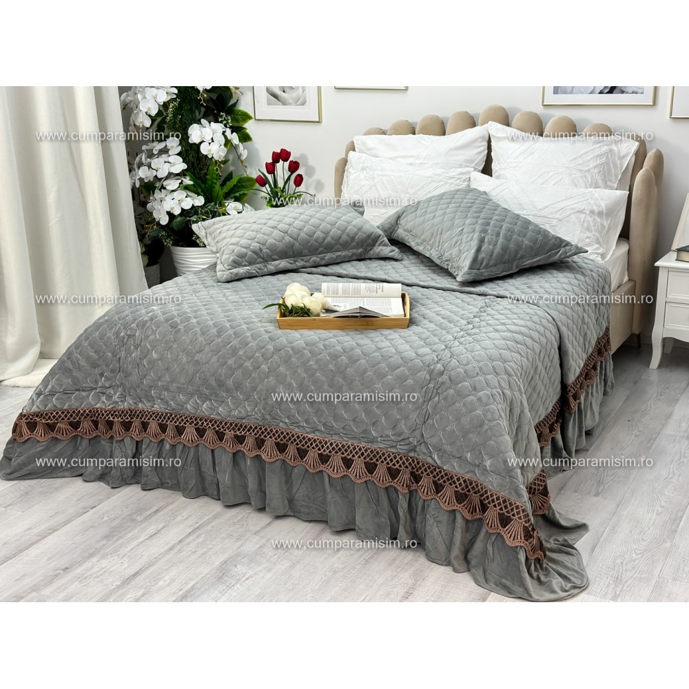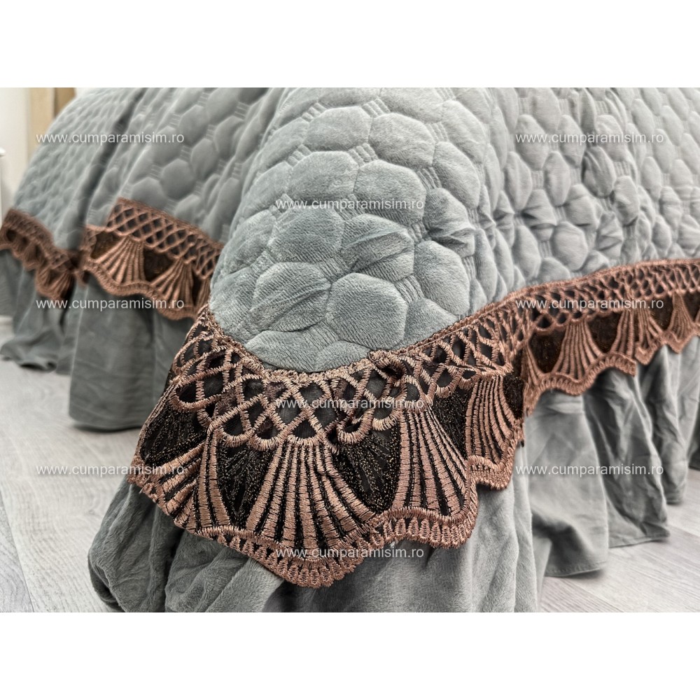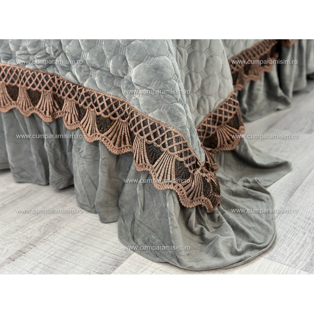 Cuvertură de lux, pentru pat 2 persoane, din catifea, matlasata, cu volanase pe partea de jos, accesorizate cu o eleganta broderie aurier, pentru un plus de eleganta si rafinament.