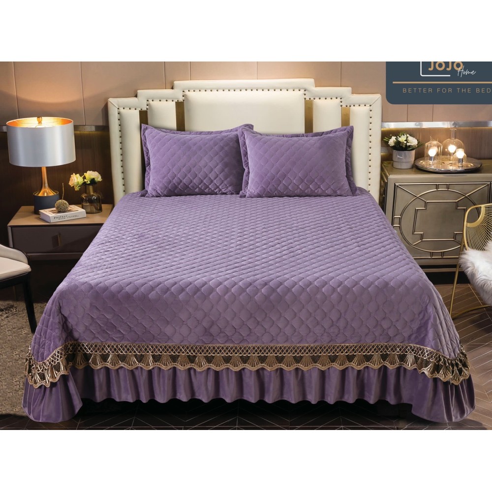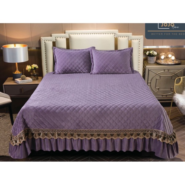 Cuvertura pat dublu, 3 piese, Catifea Matlasata cu Broderie Aurie, 250x270cm, Jojo Home, Mov, cod produs: JOC201