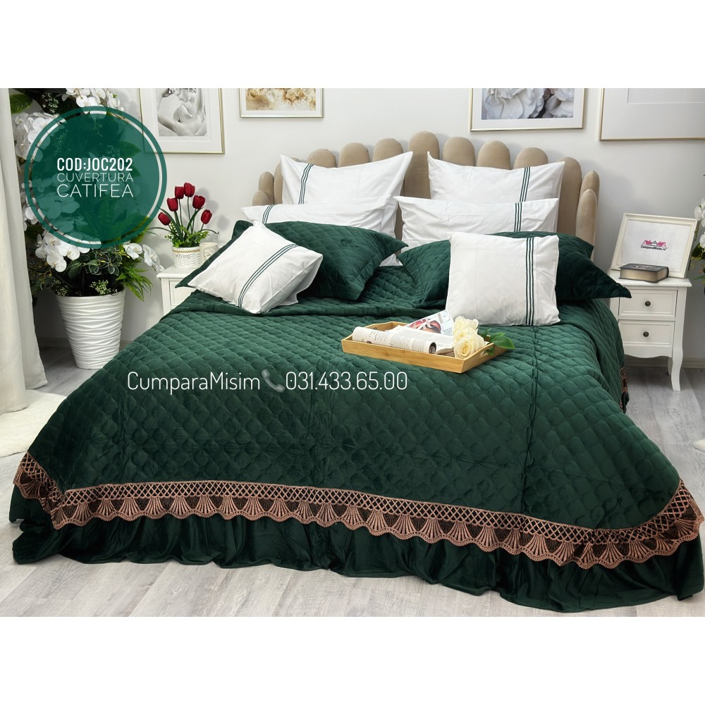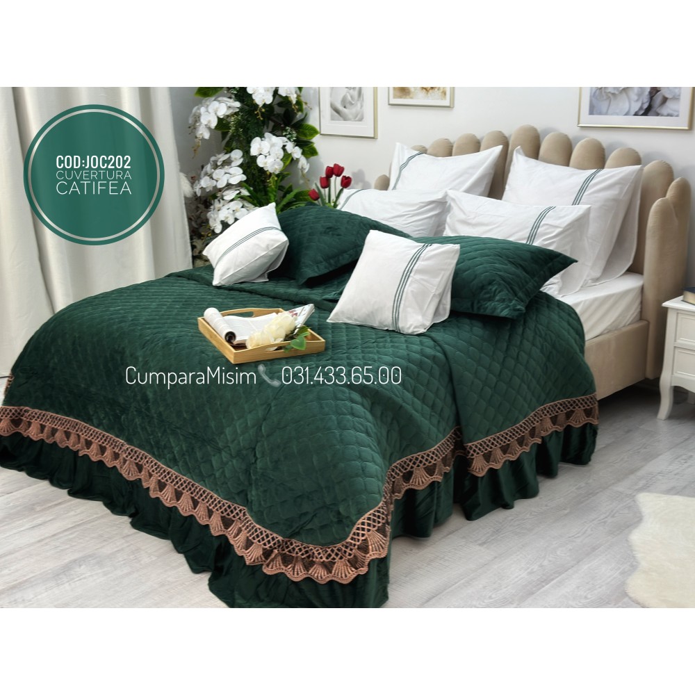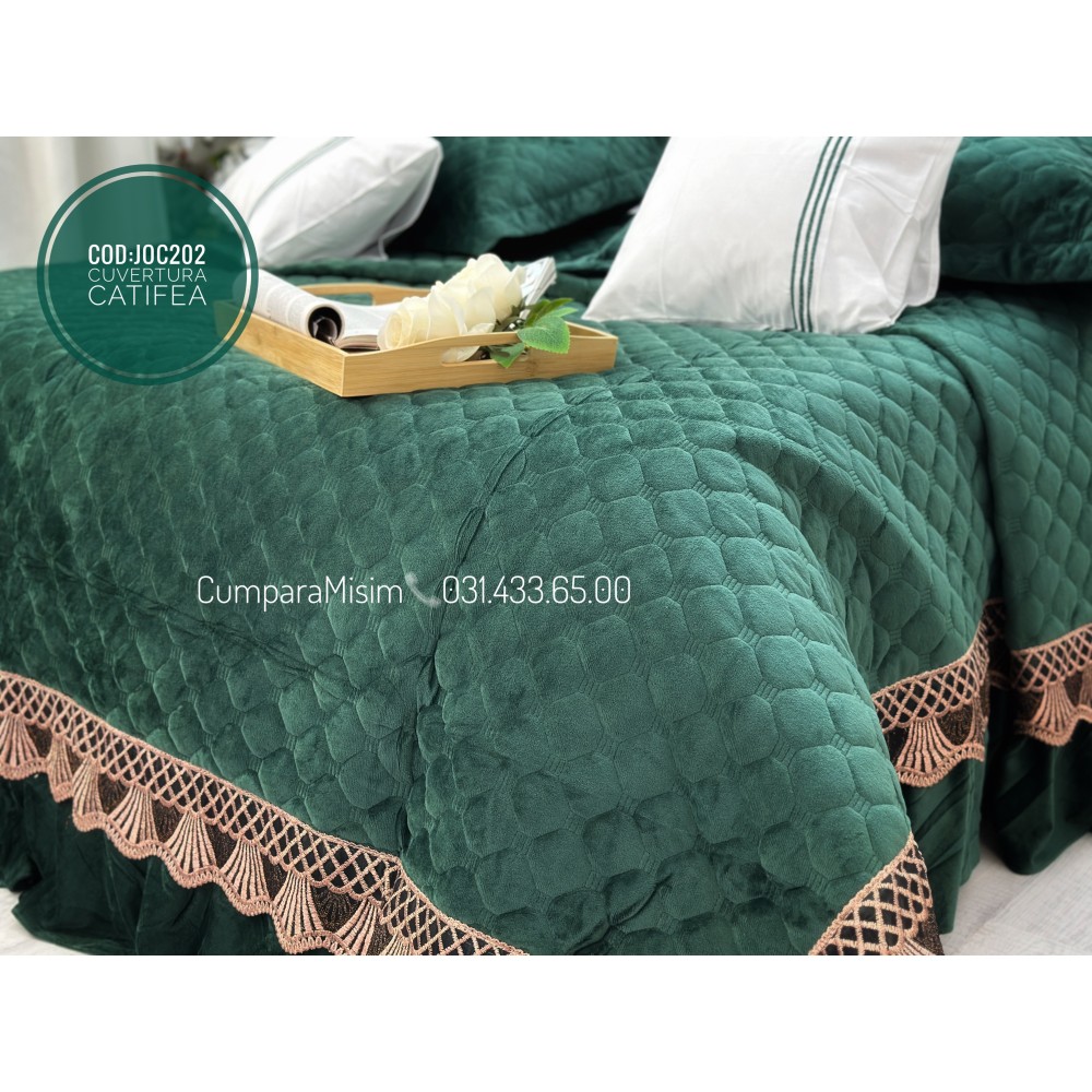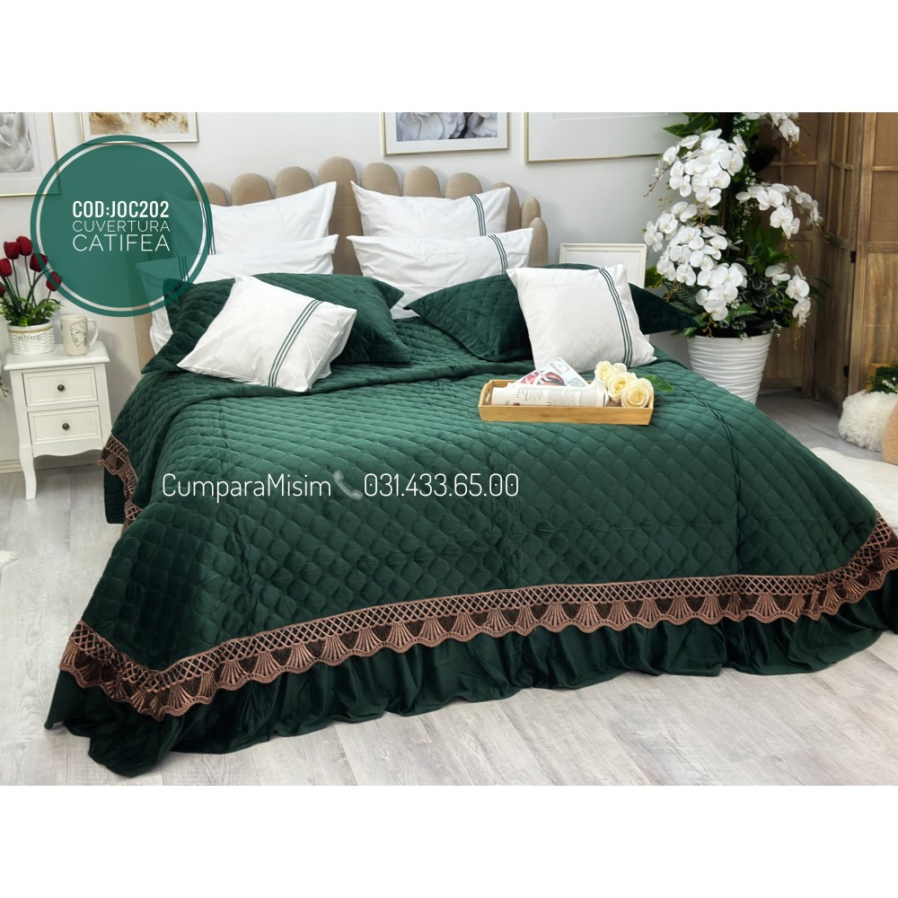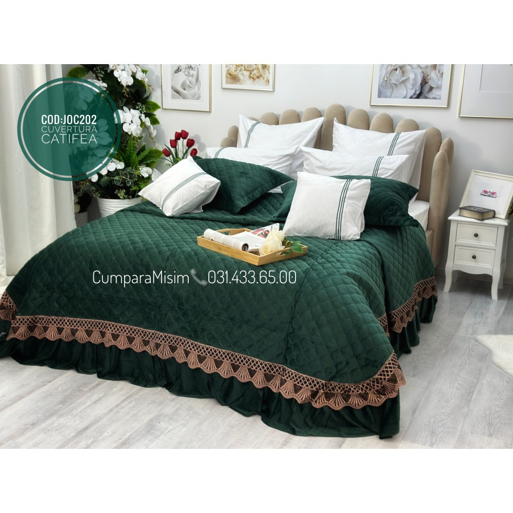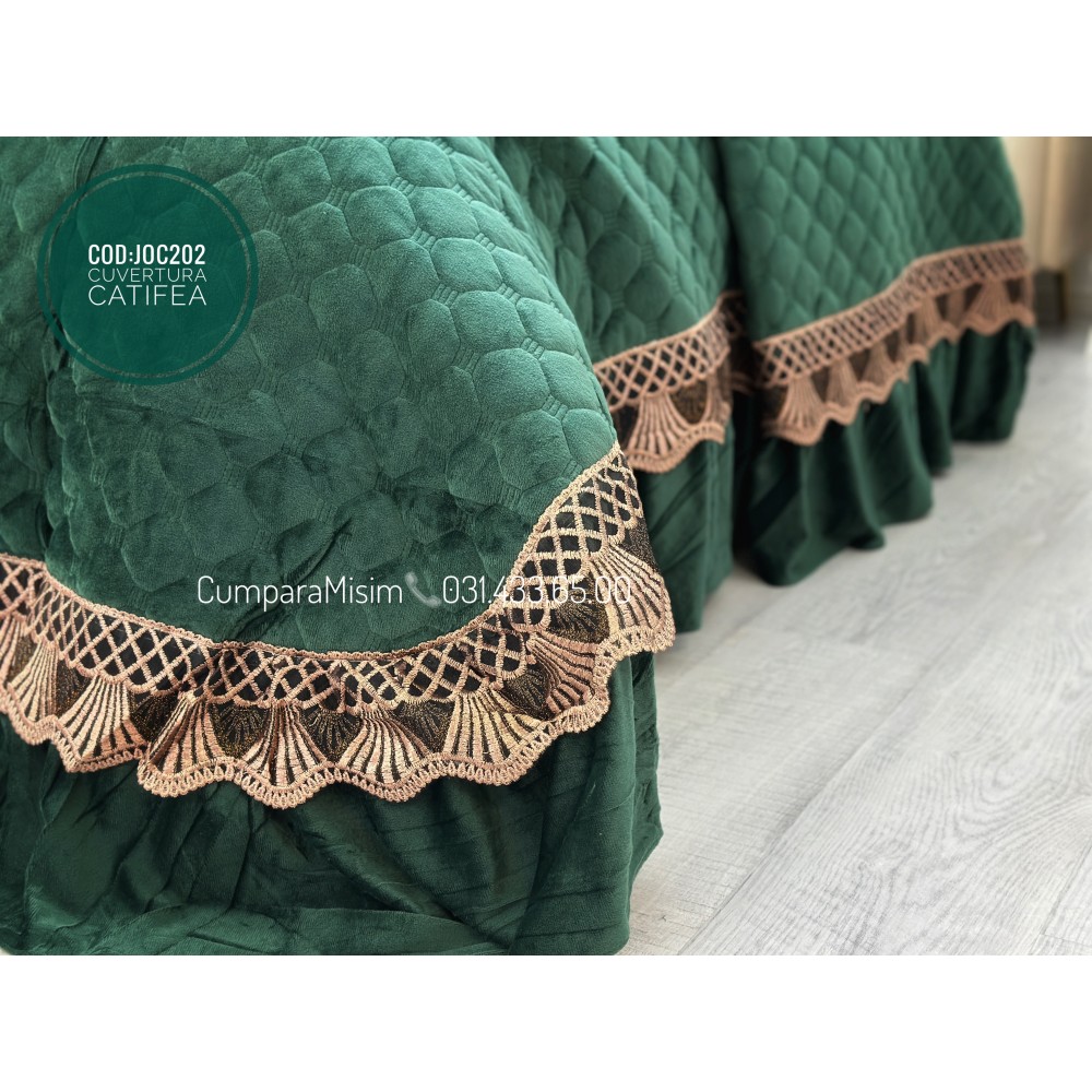 Cuvertură de lux, pentru pat 2 persoane, din catifea, matlasata, cu volanase pe partea de jos, accesorizate cu o eleganta broderie aurier, pentru un plus de eleganta si rafinament.