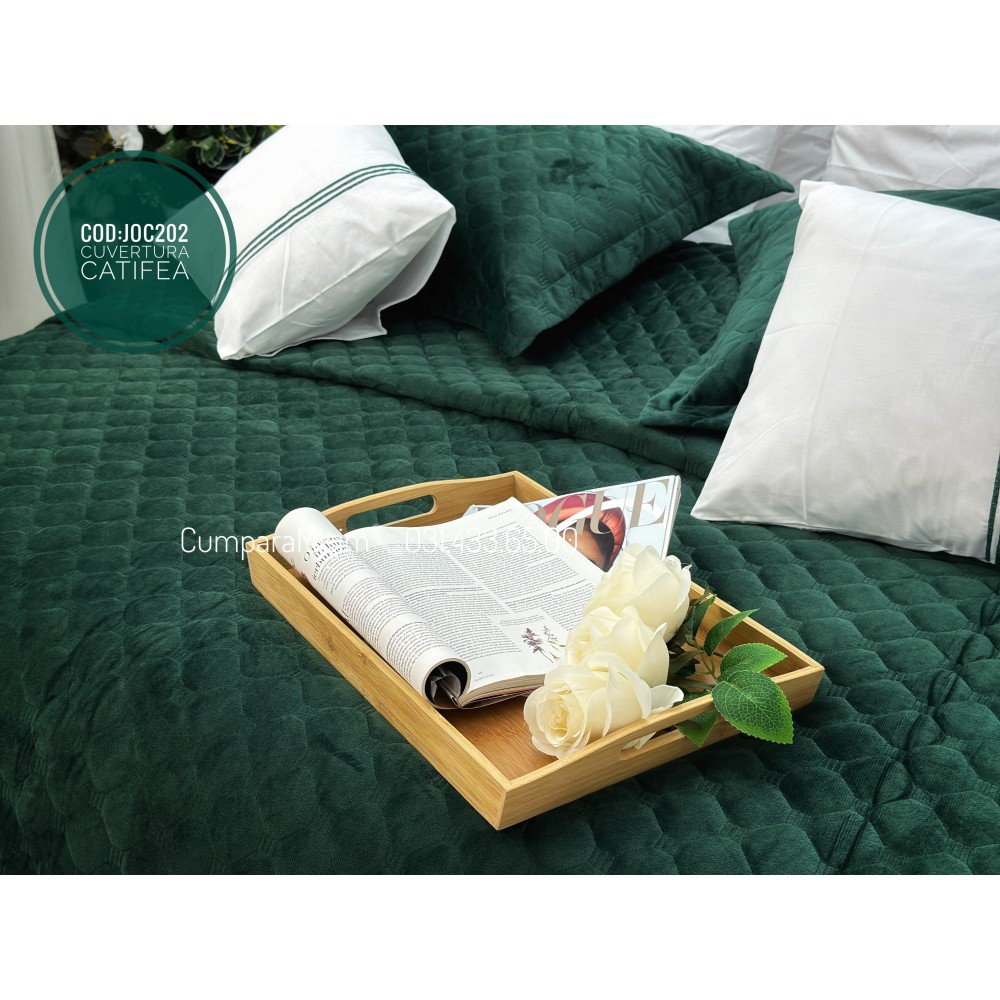 Cuvertura pat dublu, 3 piese, Catifea Matlasata cu Broderie Aurie, 250x270cm, Jojo Home, Verde Smarald, cod produs: JOC202