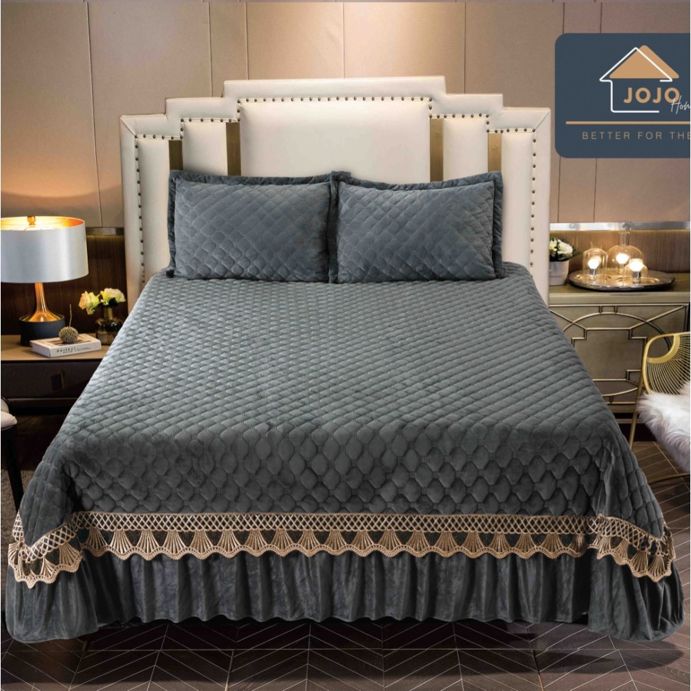 Cuvertura pat dublu, 3 piese, Catifea Matlasata cu Broderie Aurie, 250x270cm, Jojo Home, Gri inchis, cod produs: JOC213