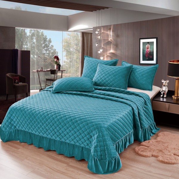 Cuvertura pat dublu, 3 piese, Catifea Matlasata cu volanas, 220x240cm + 2 fete de perne 50x70cm, albastru, CumparaMisim, cod produs: YAC407