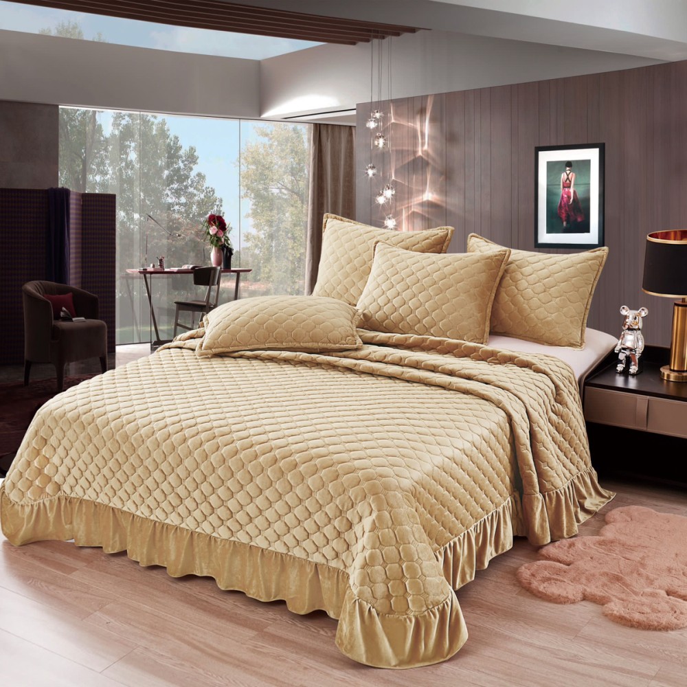 Cuvertura pat dublu, 3 piese, Catifea Matlasata cu volanas, 220x240cm + 2 fete de perne 50x70cm, bej, CumparaMisim, cod produs: YAC405