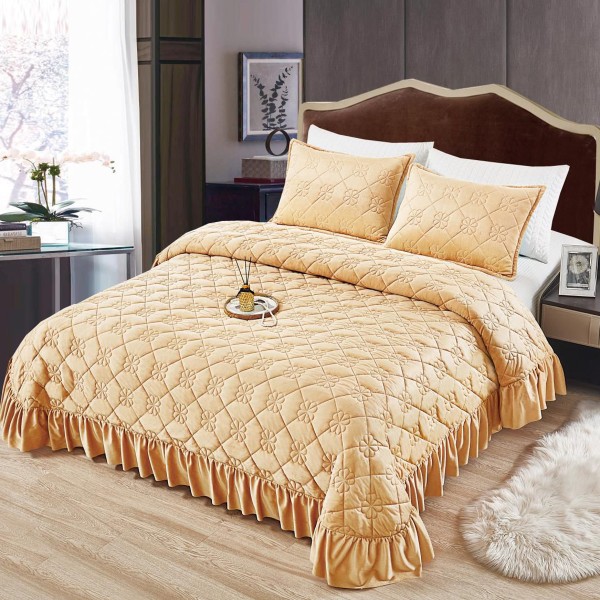 Cuvertura pat dublu, 3 piese, Catifea Matlasata cu volanas, 220x240cm + 2 fete de perne 50x70cm, bej gold, CumparaMisim, cod produs: YAC500