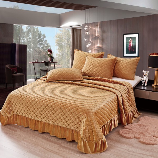 Cuvertura pat dublu, 3 piese, Catifea Matlasata cu volanas, 220x240cm + 2 fete de perne 50x70cm, camel, CumparaMisim, cod produs: YAC402