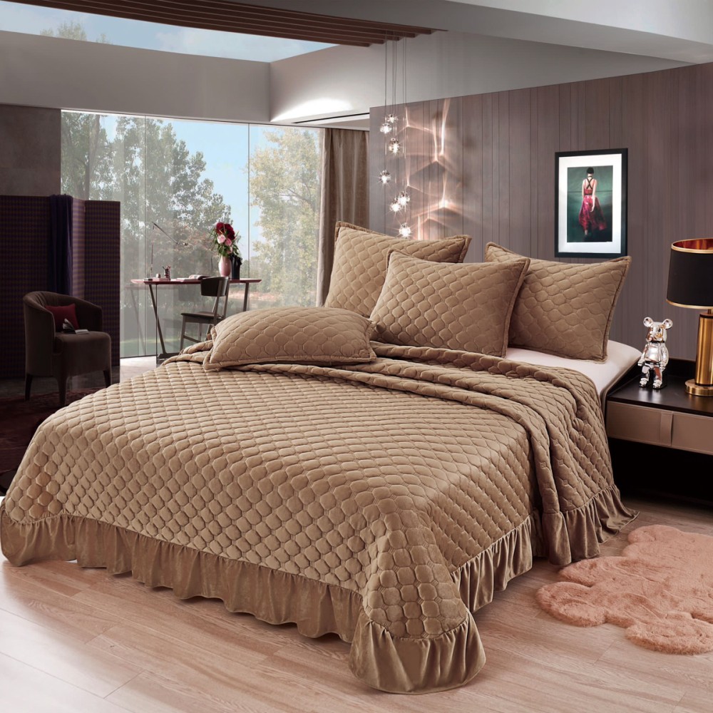 Cuvertura pat dublu, 3 piese, Catifea Matlasata cu volanas, 220x240cm + 2 fete de perne 50x70cm, cappuccino, CumparaMisim, cod produs: YAC404