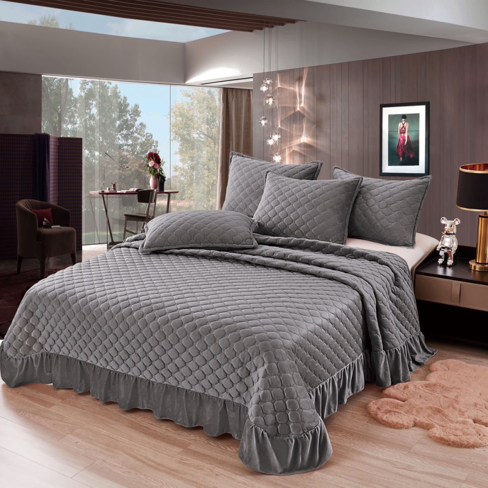 Cuvertura pat dublu, 3 piese, Catifea Matlasata cu volanas, 220x240cm + 2 fete de perne 50x70cm, gri, CumparaMisim, cod produs: YAC400