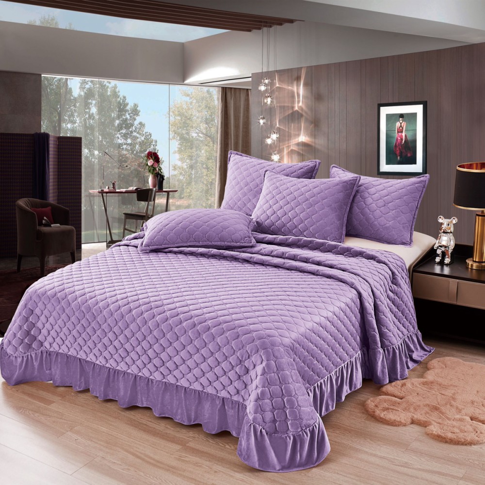 Cuvertura pat dublu, 3 piese, Catifea Matlasata cu volanas, 220x240cm + 2 fete de perne 50x70cm, lila, CumparaMisim, cod produs: YAC409