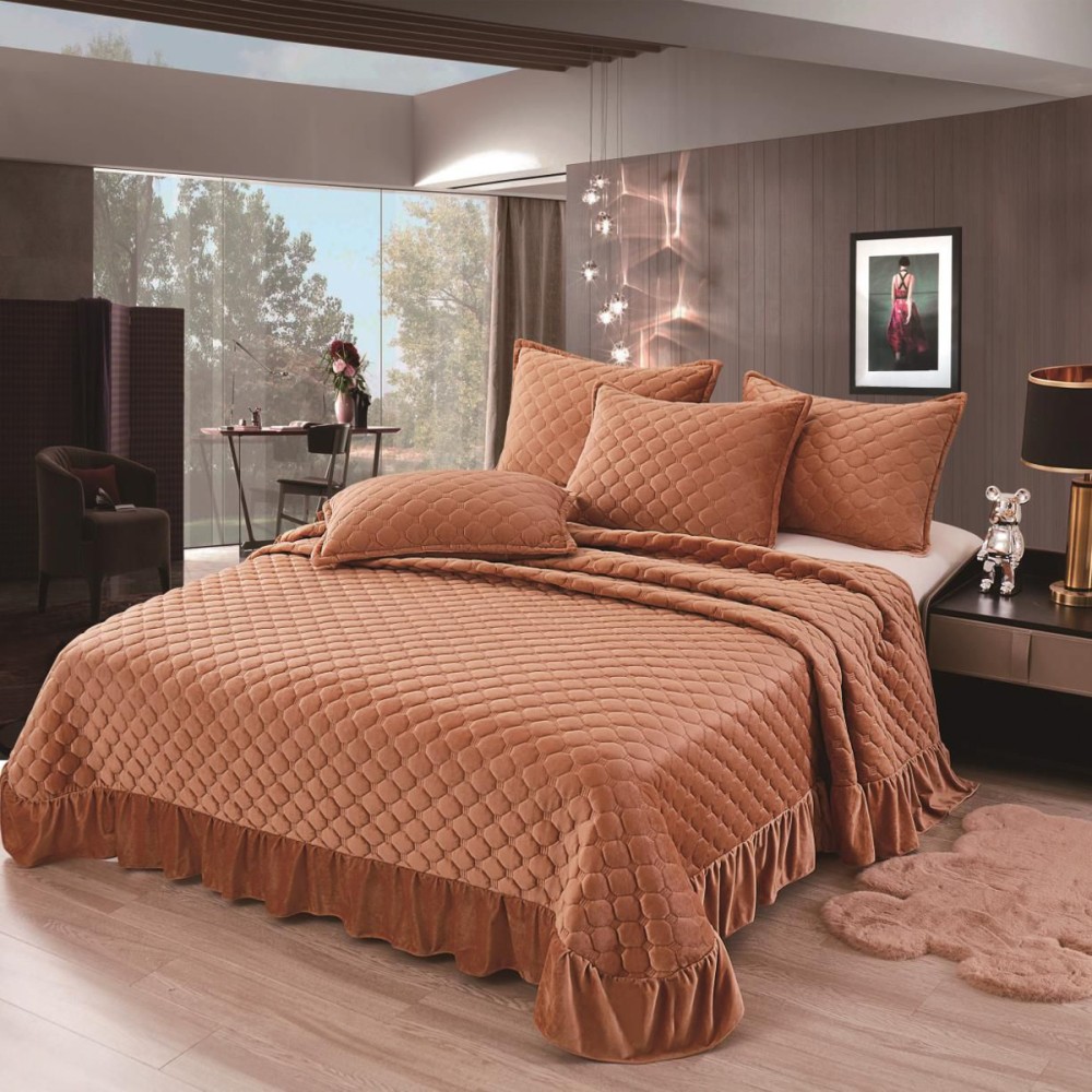 Cuvertura pat dublu, 3 piese, Catifea Matlasata cu volanas, 220x240cm + 2 fete de perne 50x70cm, maro, CumparaMisim, cod produs: YAC401