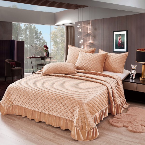 Cuvertura pat dublu, 3 piese, Catifea Matlasata cu volanas, 220x240cm + 2 fete de perne 50x70cm, piersica, CumparaMisim, cod produs: YAC406