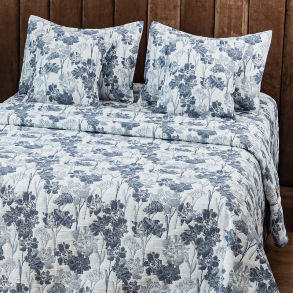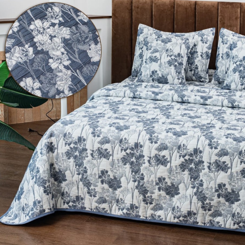 Cuvertură Pat Dublu, Bumbac cu In, Model Brodat Direct în Tesătură, 230x250 cm, 2 fete de perna 52x72cm, 2 fete de perna 46x46cm, Alb, Albastru, Flori, Casa Minunata, cod produs: INS-CVY01