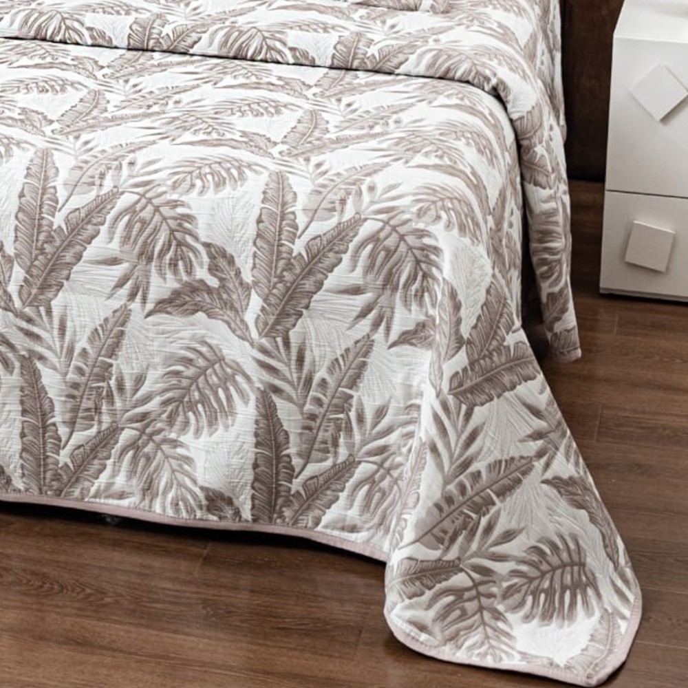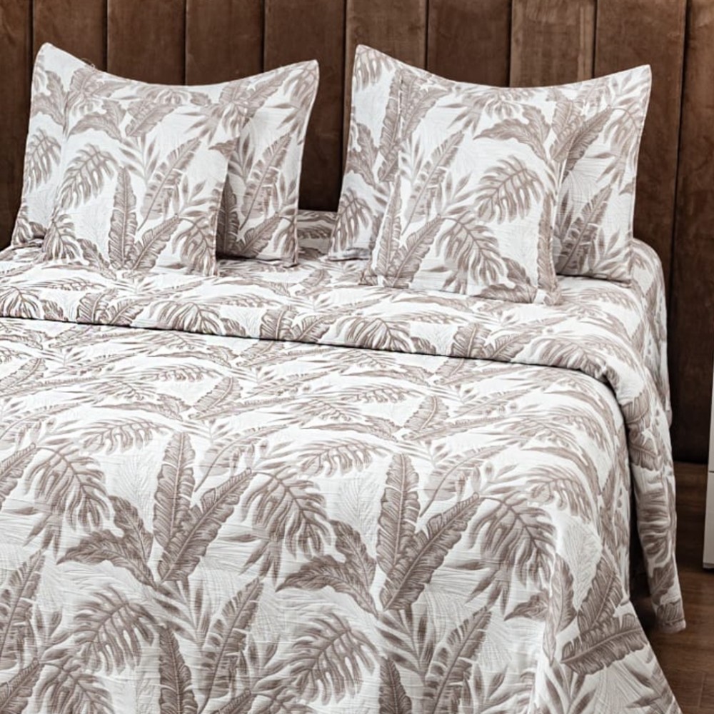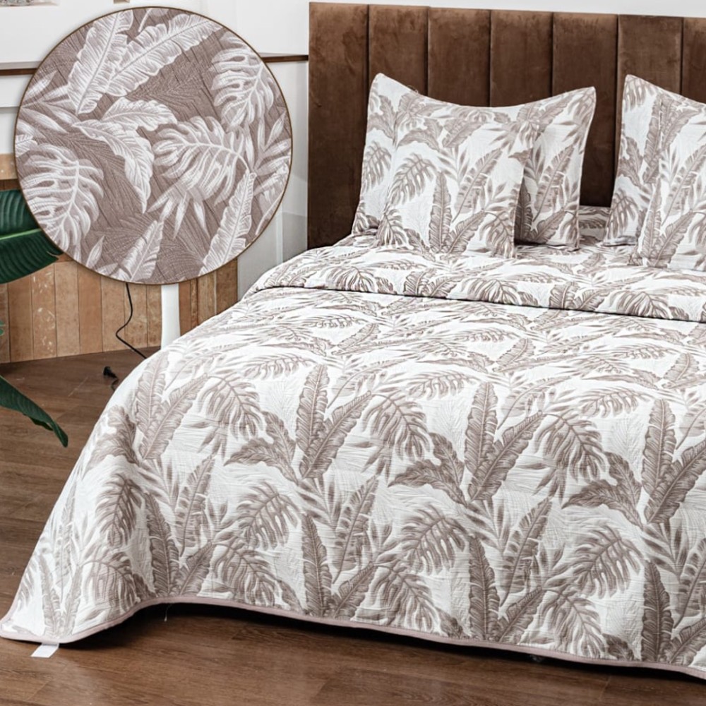 Cuvertură Pat Dublu, Bumbac cu In, Model Brodat Direct în Tesătură, 230x250 cm, 2 fete de perna 52x72cm, 2 fete de perna 46x46cm, Alb, Bej, Frunze, Casa Minunata, cod produs: INS-CVY03