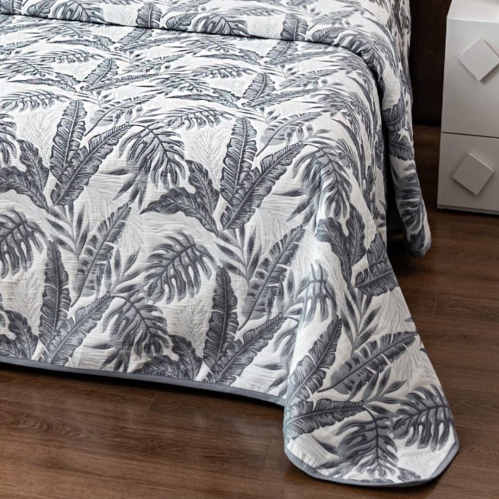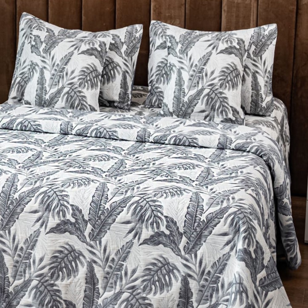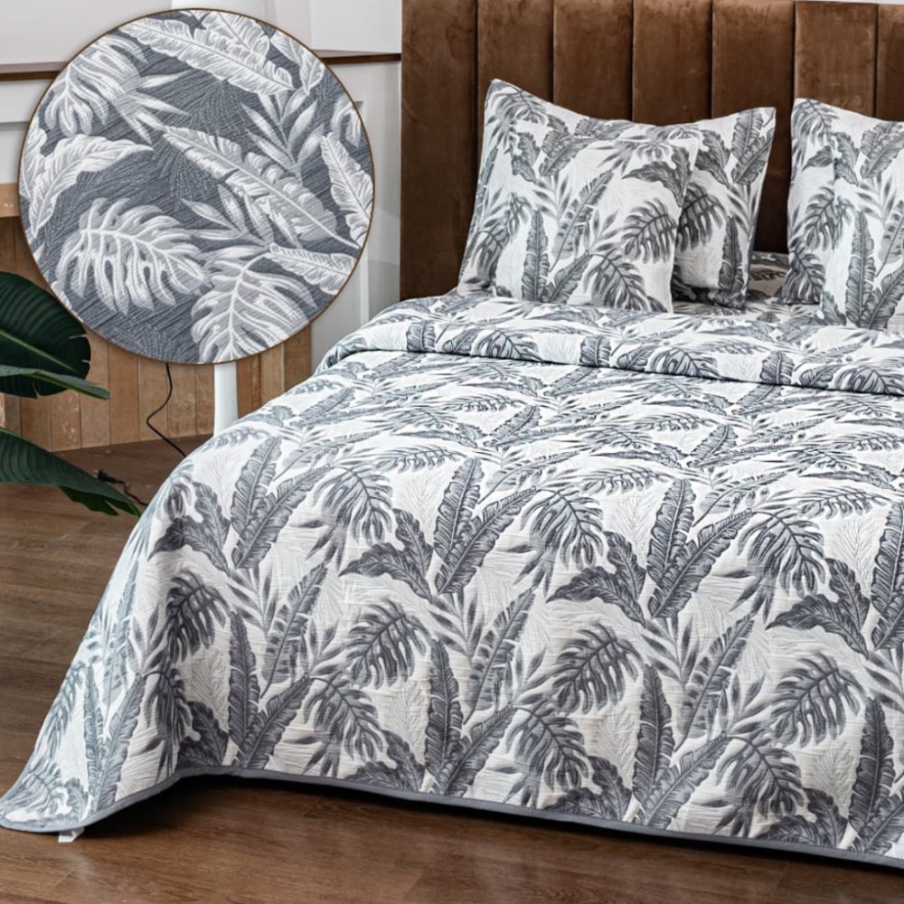 Cuvertură Pat Dublu, Bumbac cu In, Model Brodat Direct în Tesătură, 230x250 cm, 2 fete de perna 52x72cm, 2 fete de perna 46x46cm, Alb, Gri, Frunze, Casa Minunata, cod produs: INS-CVY04