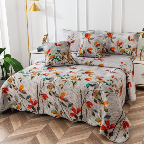 Cuvertură Pat Dublu, Bumbac Matlasat, 230x250 cm, 2 fete de perna 60x80cm, 2 fete de perna 55x55cm, Gri, Frunze, Casa Minunata, cod produs: INS-CVM02