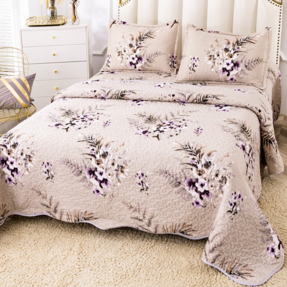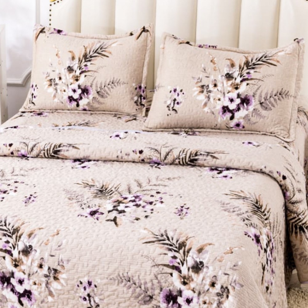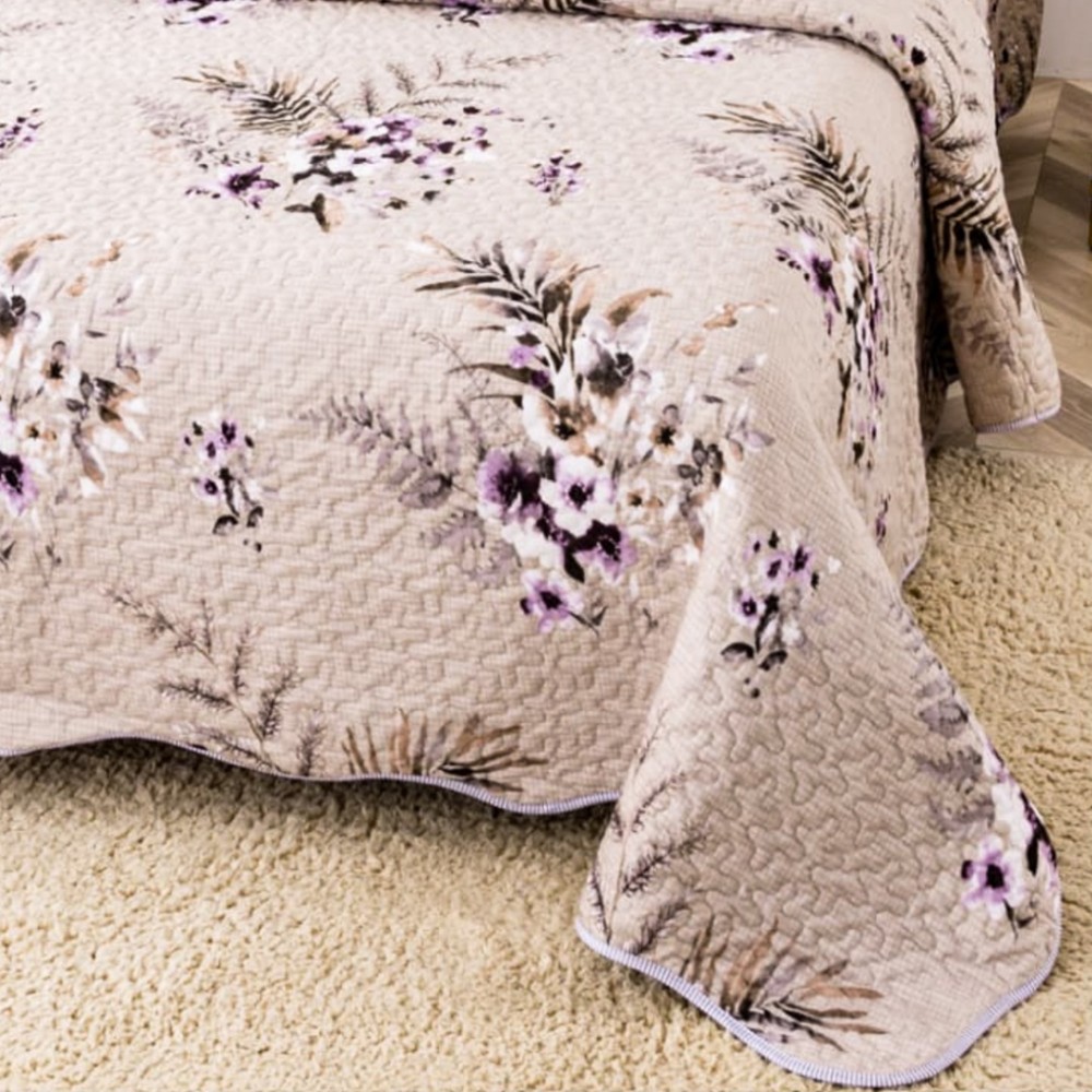 Cuvertură Pat Dublu, Catifea Matlasată, 230x250 cm, 2 fete de perna 60x80cm, Bej, Flori, Casa Minunata, cod produs: INS-CVK02