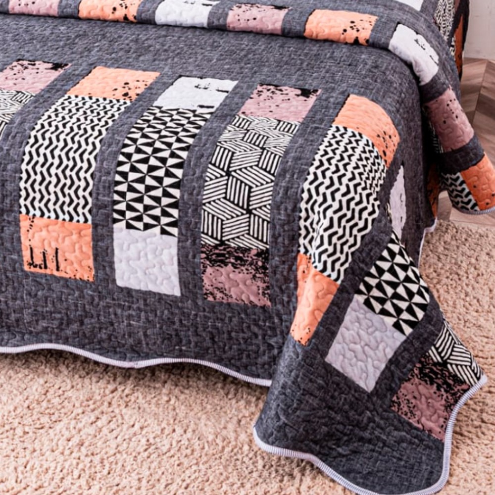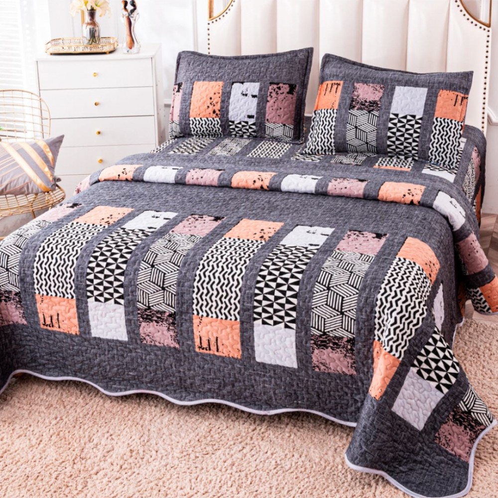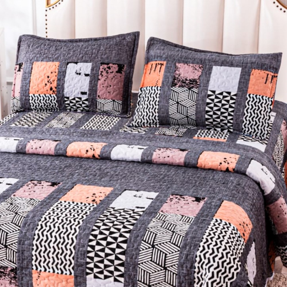 Cuvertură Pat Dublu, Catifea Matlasată, 230x250 cm, 2 fete de perna 60x80cm, Gri, Forme Geometrice, Casa Minunata, cod produs: INS-CVK08