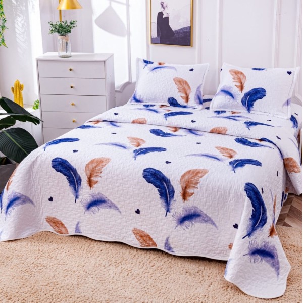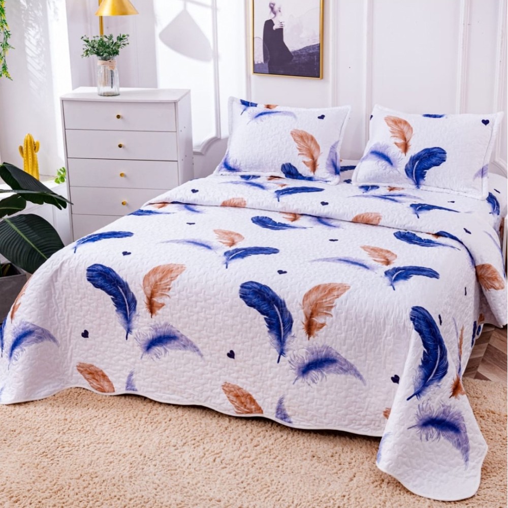 Cuvertura pat dublu din Bumbac Satinat Superior, 3 PIESE, Albastru, pene, inimioare, Alti producatori, cod produs: CVP26