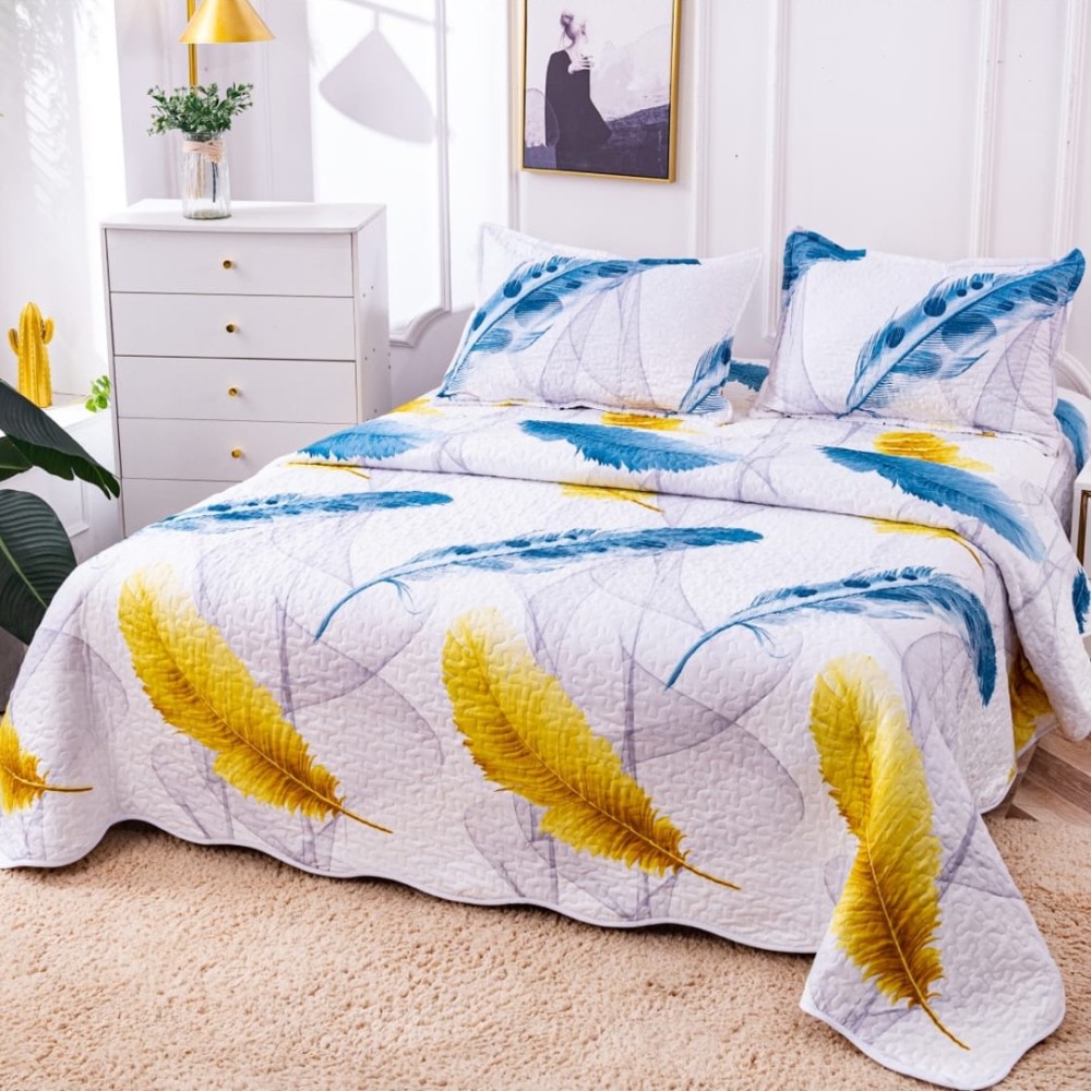 Cuvertura pat dublu din Bumbac Satinat Superior, 3 PIESE, Albastru-Galben, pene, Alti producatori, cod produs: CVP19