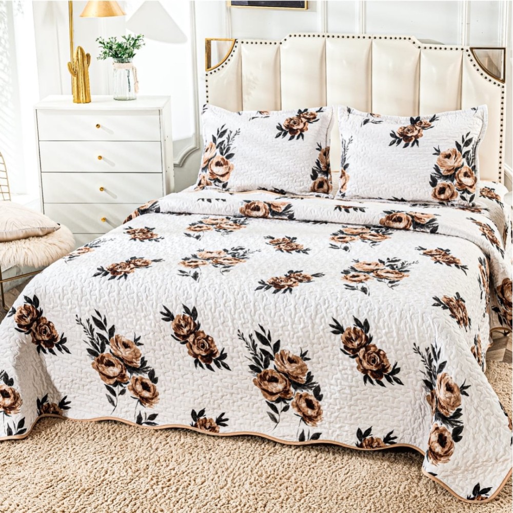 Cuvertura pat dublu din Bumbac Satinat Superior, 3 PIESE, Bej, trandafiri, Alti producatori, cod produs: CVP189