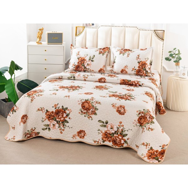 Cuvertura pat dublu din Bumbac Satinat Superior, 3 PIESE, Bej-Maro, flori, Alti producatori, cod produs: CVP131