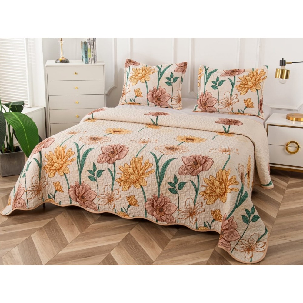Cuvertura pat dublu din Bumbac Satinat Superior, 3 PIESE, Bej-Verde, flori, frunze, Alti producatori, cod produs: CVP124