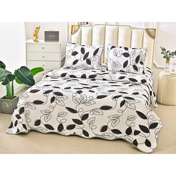 Cuvertura pat dublu din Bumbac Satinat Superior, 3 PIESE, Crem-Negru, frunze, Alti producatori, cod produs: CVP137
