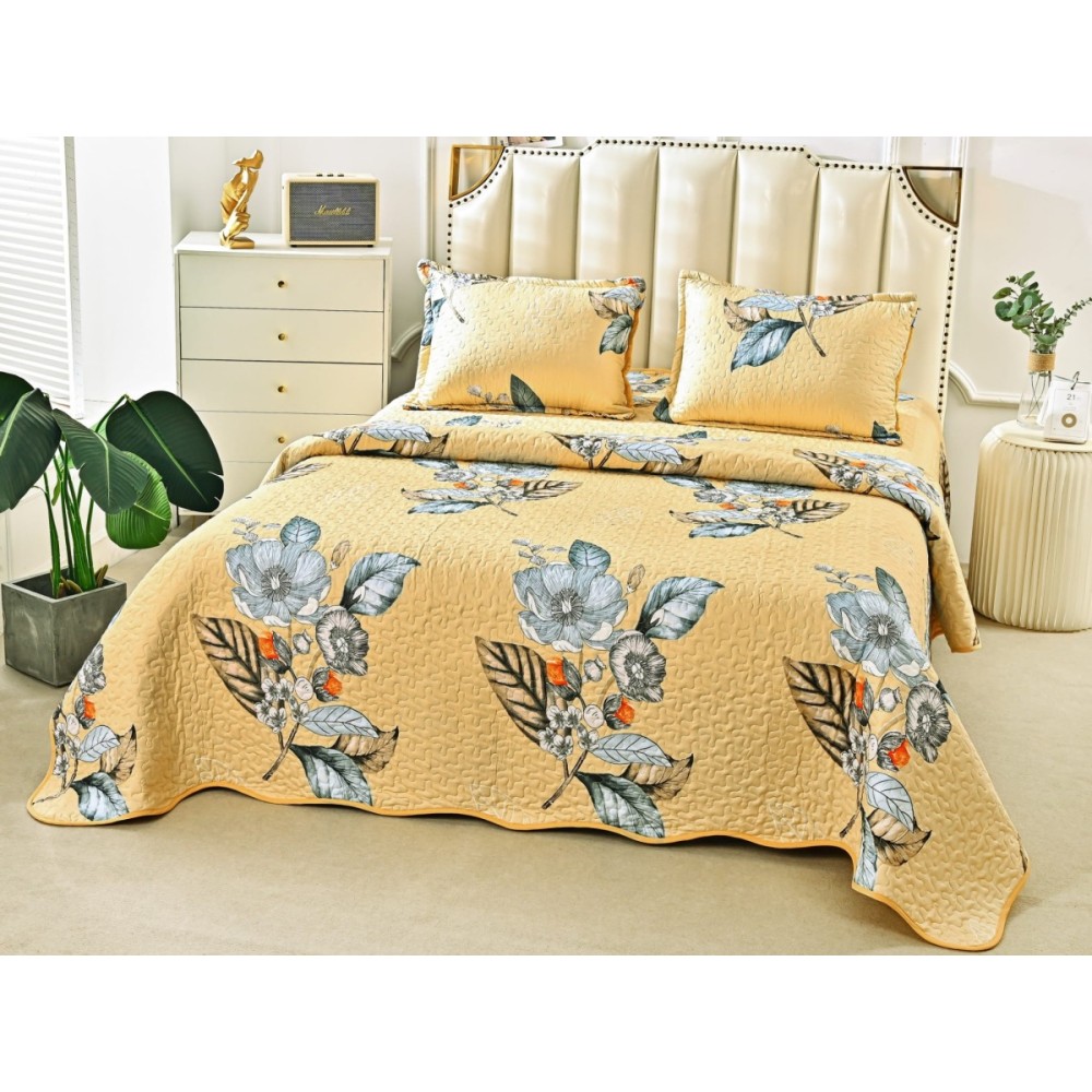 Cuvertura pat dublu din Bumbac Satinat Superior, 3 PIESE, Galben-Gri, flori, Alti producatori, cod produs: CVP140