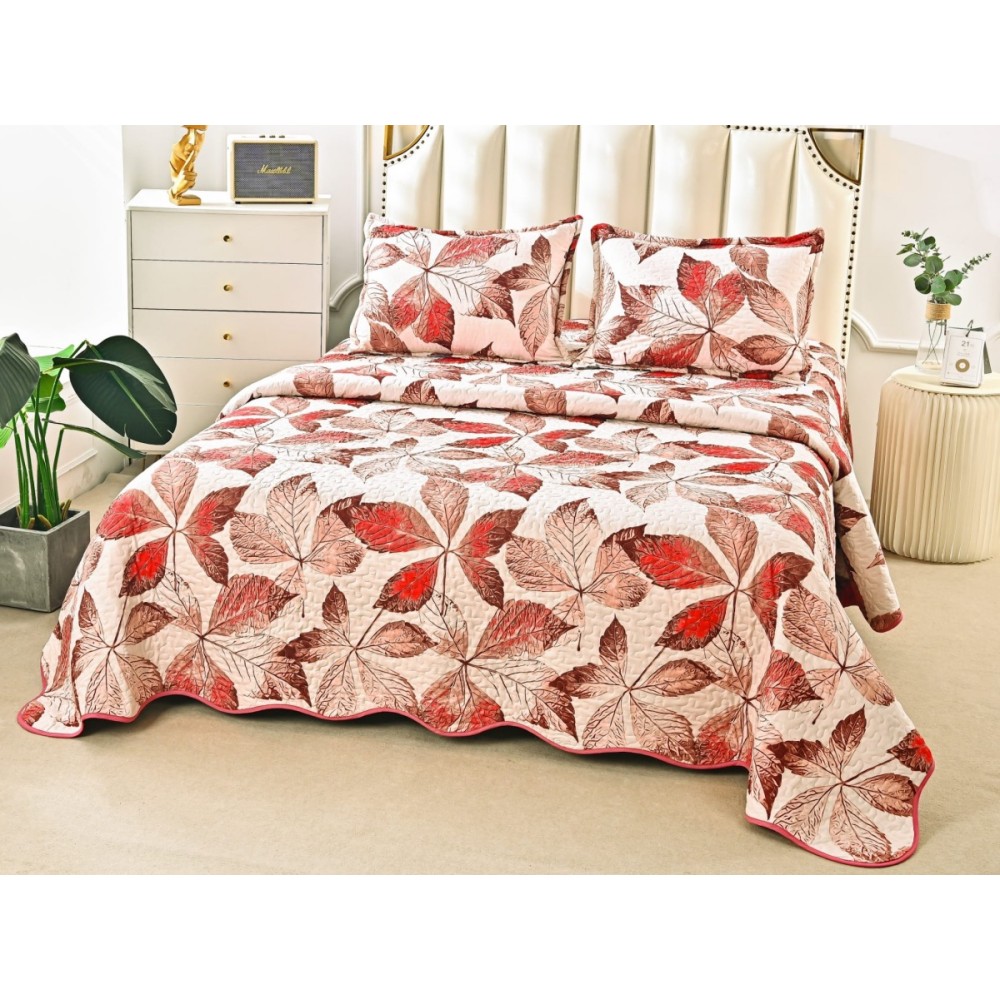 Cuvertura pat dublu din Bumbac Satinat Superior, 3 PIESE, Maro-Rosu, frunze, Alti producatori, cod produs: CVP157