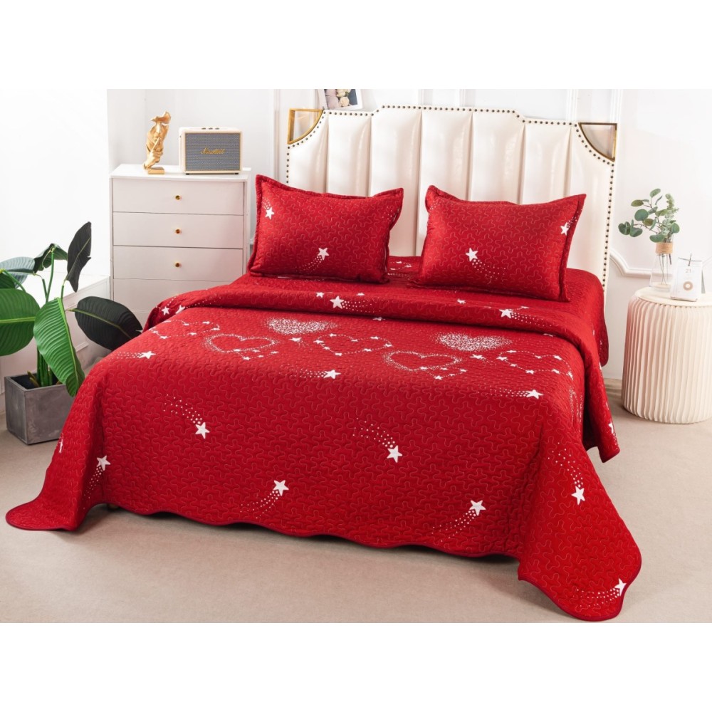 Cuvertura pat dublu din Bumbac Satinat Superior, 3 PIESE, Rosu-Alb, inimioare, stelute, Alti producatori, cod produs: CVP179