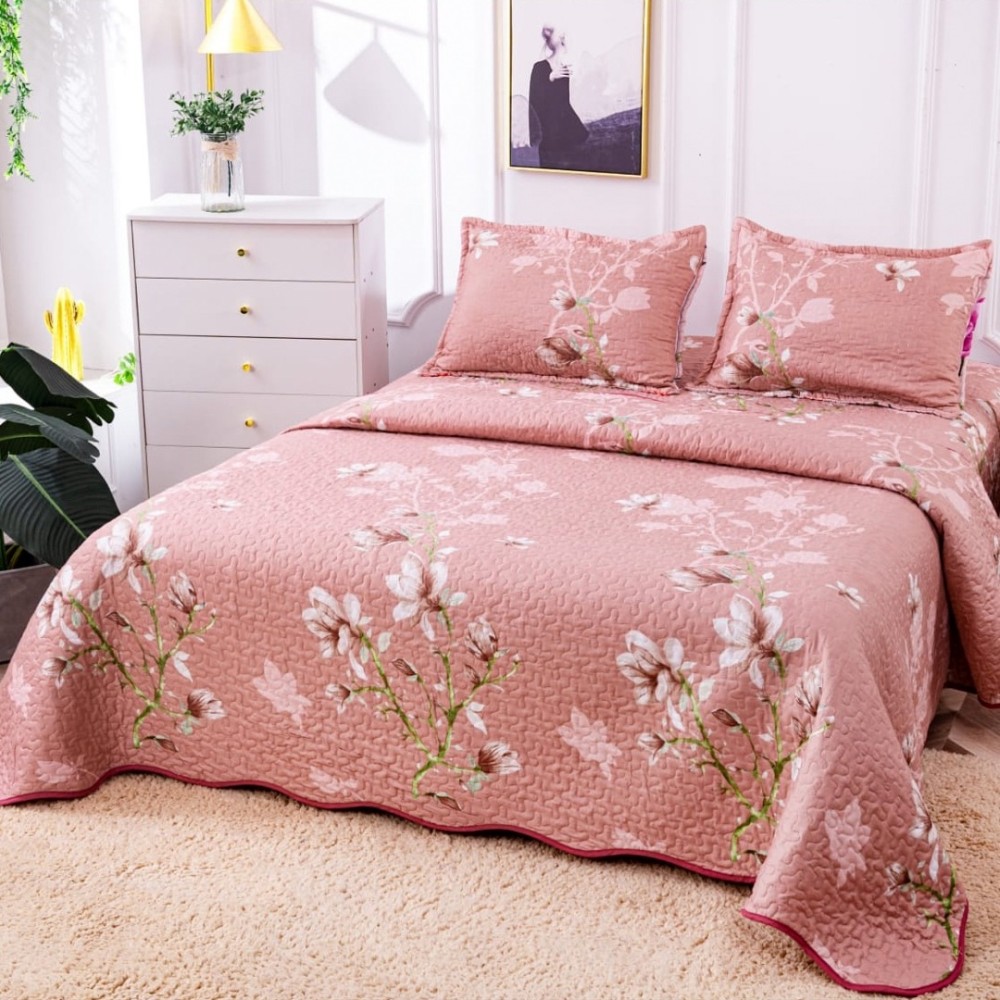 Cuvertura pat dublu din Bumbac Satinat Superior, 3 PIESE, Roz pudra, flori, Alti producatori, cod produs: CVP27