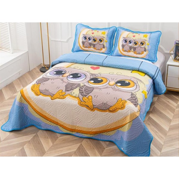 Cuvertura pat dublu, din bumbac tip finet, Identica cu Poza, 3 PIESE, Albastru, bufnite, Alti producatori, cod produs: CVP225