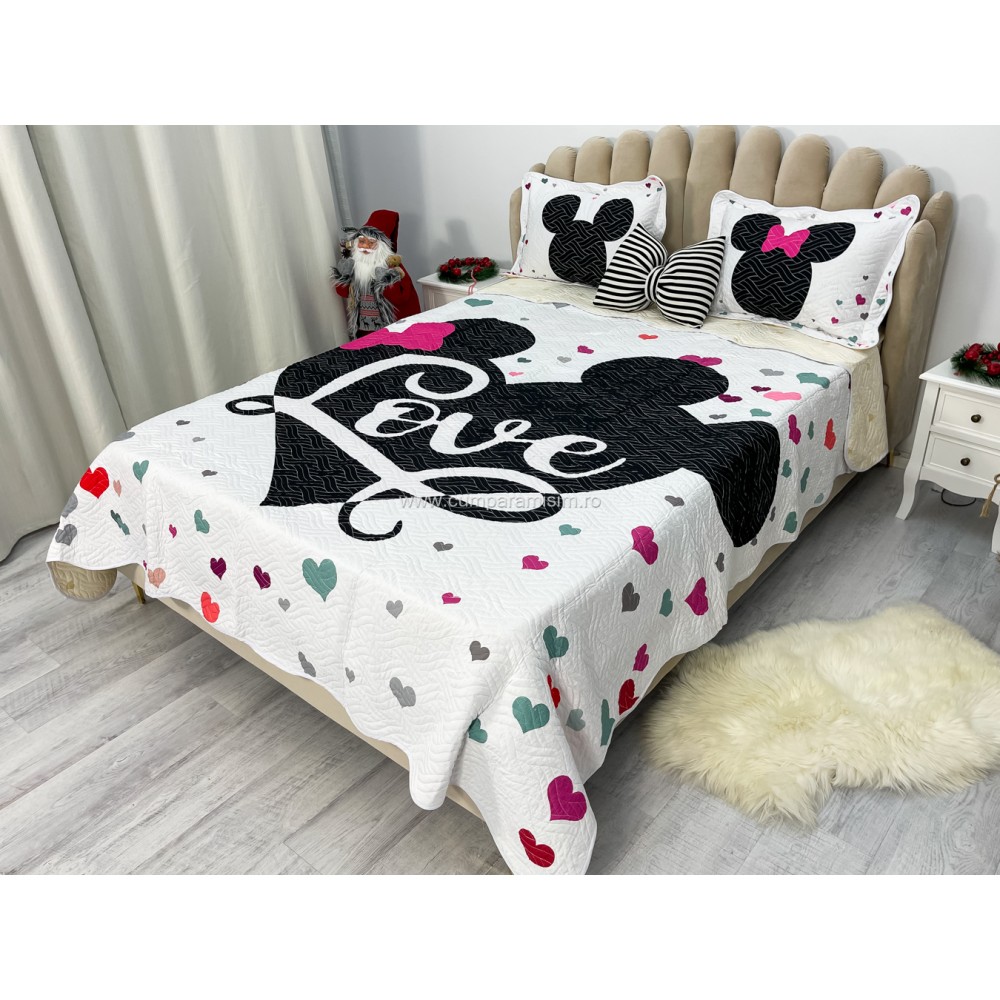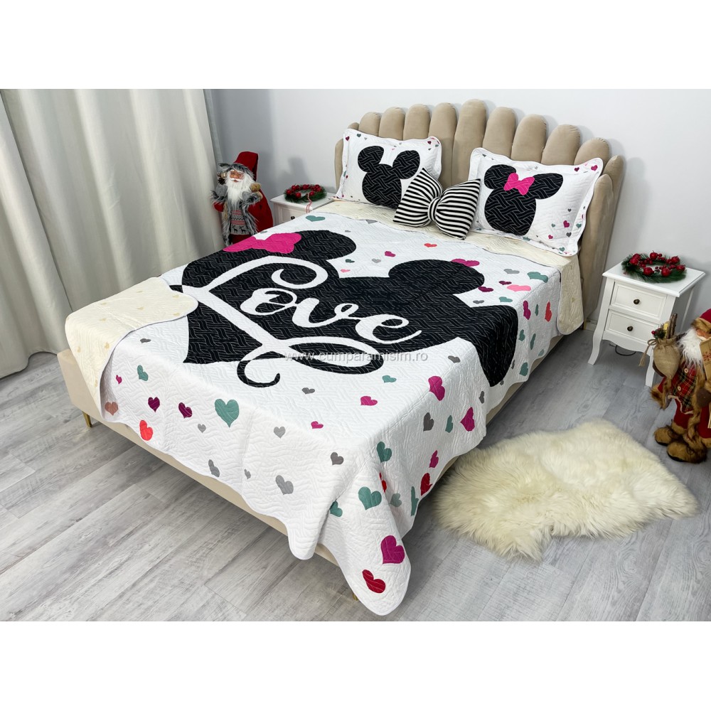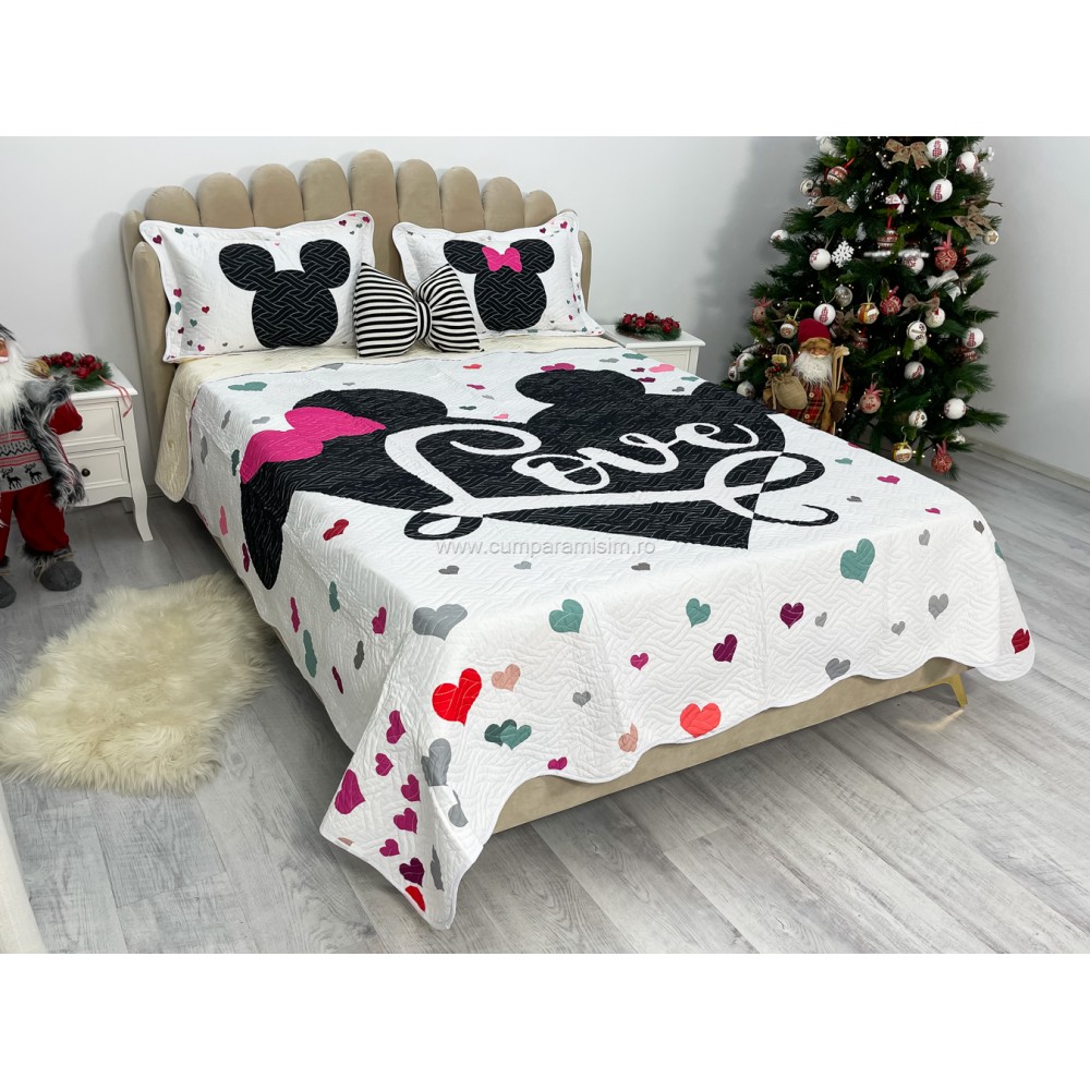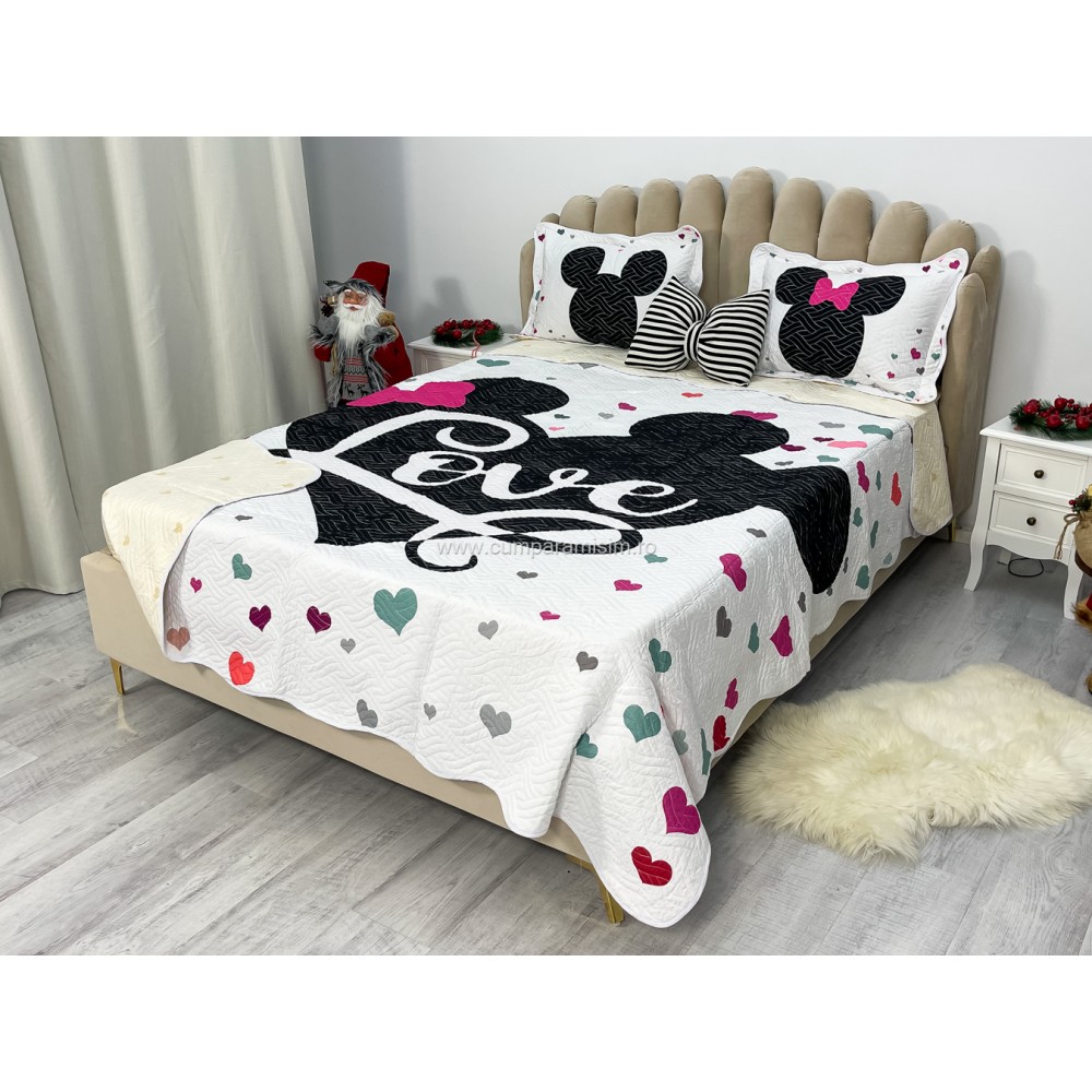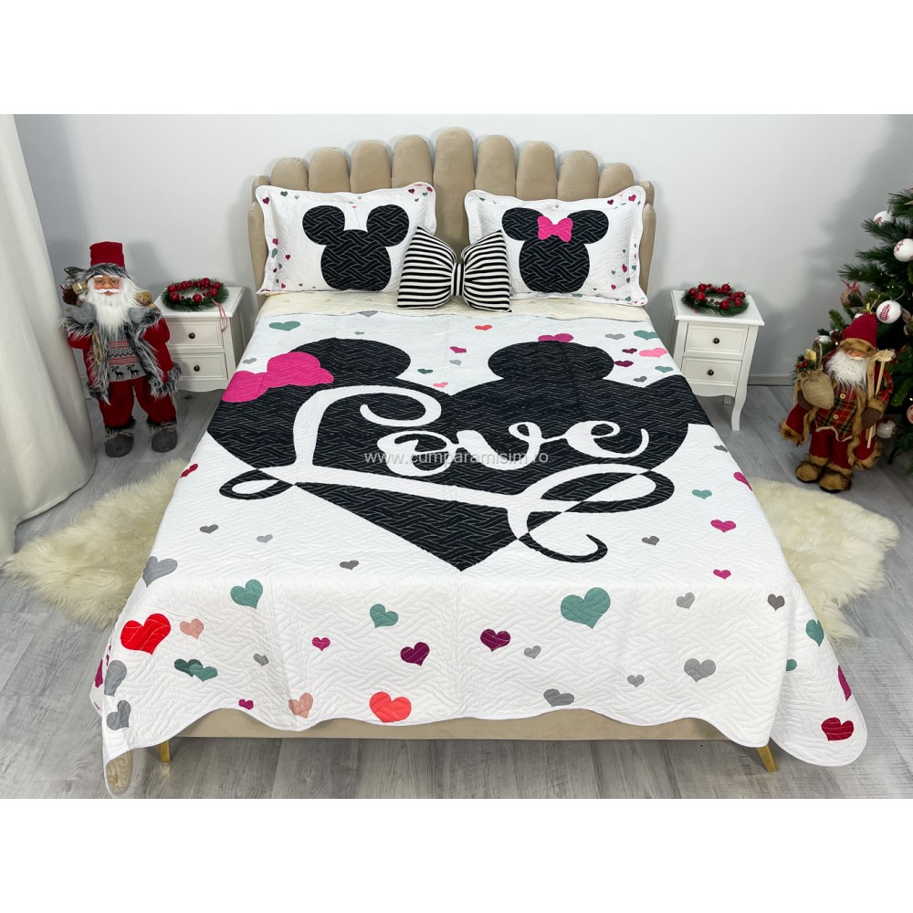 Cuvertura pat dublu, din bumbac tip finet, Identica cu Poza, 3 PIESE, Alb, Mickey&Minnie Mouse, inimioare, Disney, cod produs: CVP235